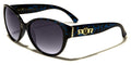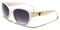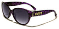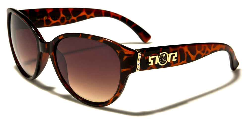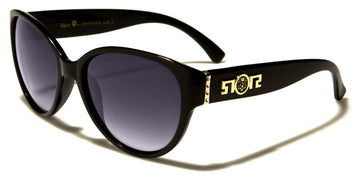 These cat eye sunglasses for women are designed by Kleo. The frames are made of plastic and have an eye-catching logo on the arms in gold lettering. The arms are thick in the middle and taper down to a curve at the earpiece. The lenses are round in the cat eye style, giving the wearer a sophisticated appearance. The gradient lenses offer privacy and ultraviolet protection. These sunglasses are available in different colors and prints and can be purchased in bulk for a cost saving.