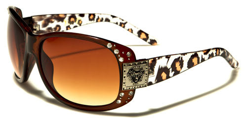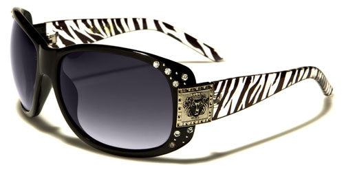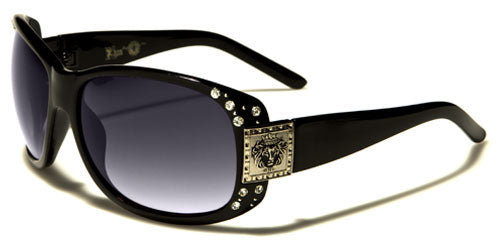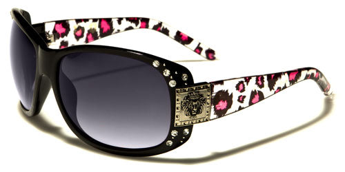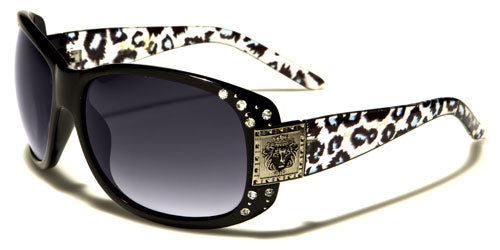 Rawr! Be fierce and fabulous with these all-black or animal print women's sunglasses. These gorgeous bulk sunglasses from Kleo feature black or brown rims that are studded with rhinestones on the sides. The thick rims also have molded nosepieces with the end pieces covered by a steel-plate bearing the iconic lion's head that is a signature of Kleo sunglasses. The thick stems come with all-black or animal print designs: zebra and leopard with red, pink, blue or orange spots. The gradient oval lenses come in smoke or brown. These sunglasses are made of high-quality plastic that is lightweight and durable for your comfort.