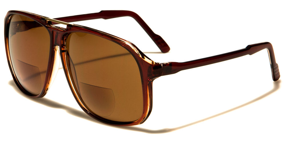 These men's bifocal bulk aviator sunglasses are made of plastic and offer UV400 protection. They are available in boxes of assorted colors in one dozen per box. These are perfect for men who need assistance reading while wearing sunglasses. Color options include a black frame with gray lenses and a brown frame with brown lenses.