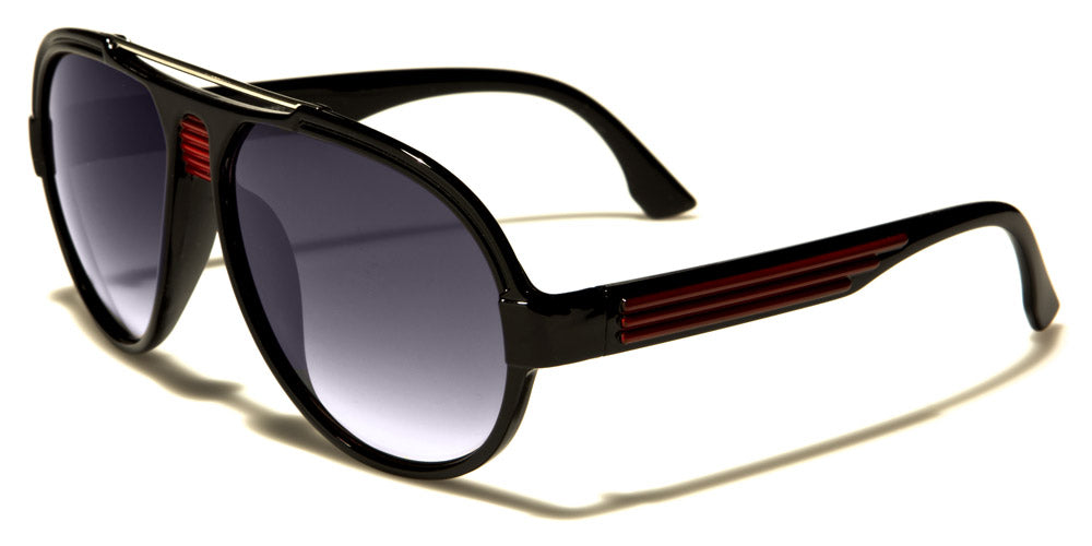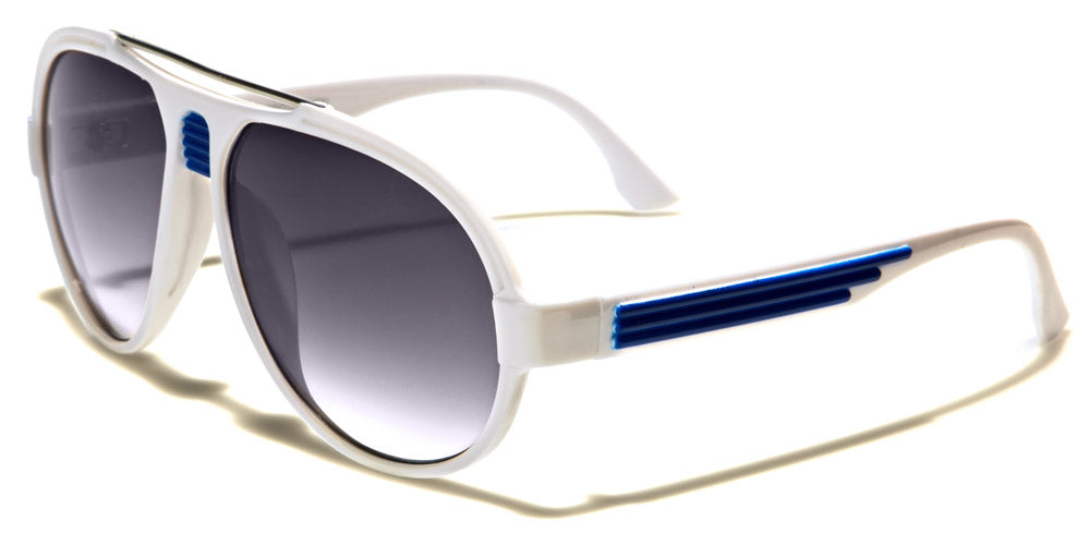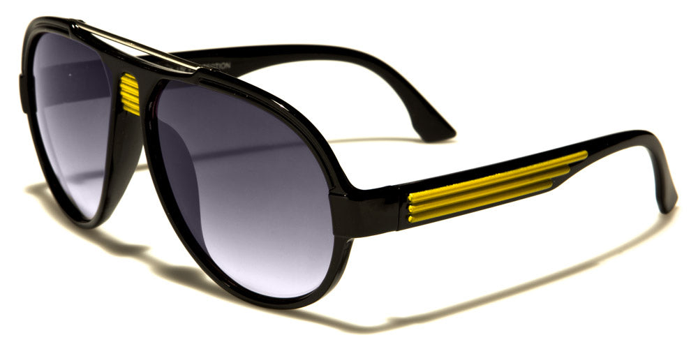 These unisex aviator sunglasses are made of plastic and feature a broad nose bridge. They offer UV400 protection, which helps protect the eyes from the sun's damaging ultraviolet rays. These sunglasses come in a wide array of colors including black and gray, black and red, black and orange, black and yellow, brown and black, and white and blue. These are available in a box of one dozen assorted colors, which makes it easy for retailers to purchase.