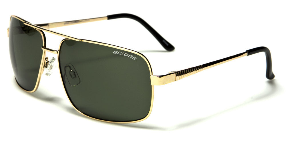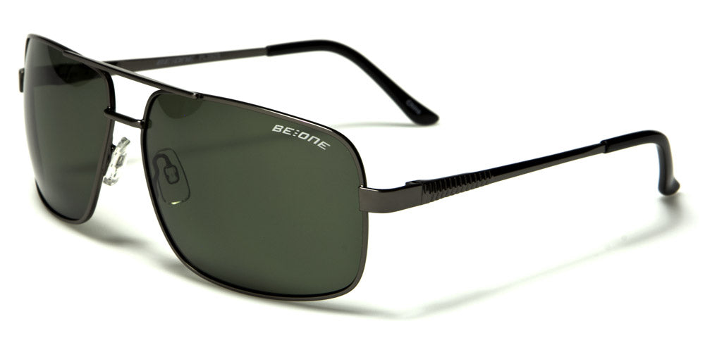 These BeOne men's polarized sunglasses offer UV400 protection, which helps prevent eye cancer and sunburns. The rectangular frame is made of metal, and the earpieces are made of plastic. Color choices include gunmetal frame with dark smoke lenses, gunmetal frame with gray lenses, gunmetal frame with green lenses, gold frame with green lenses, gunmetal frame with brown lenses, and bronze frame with brown lenses. These are available for purchase in boxes of assorted colors by the dozen, which is ideal for department stores, sunglass kiosks and other large retailers.