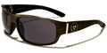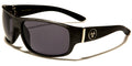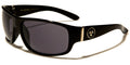 Simple but refined, these shades are great for every activity. Mirrored oval lenses are held in place by plastic frames that attach to arms/earpieces at a gold metallic bar hinge. Medium-wide arms are decorated with a metallic circular Biohazard logo before gently narrowing into curved earpieces. Each order arrives with a variety of all five style options, including: all-black frames and arms with black lenses; dark gray wood-look frames and arms with black lenses; golden-brown wood-look frames and arms with black lenses; all-black frames and arms with light gray lenses; and black-to-tortoiseshell ombre frames and arms with dark blue lenses. These sunglasses are sold in bulk by the dozen.