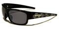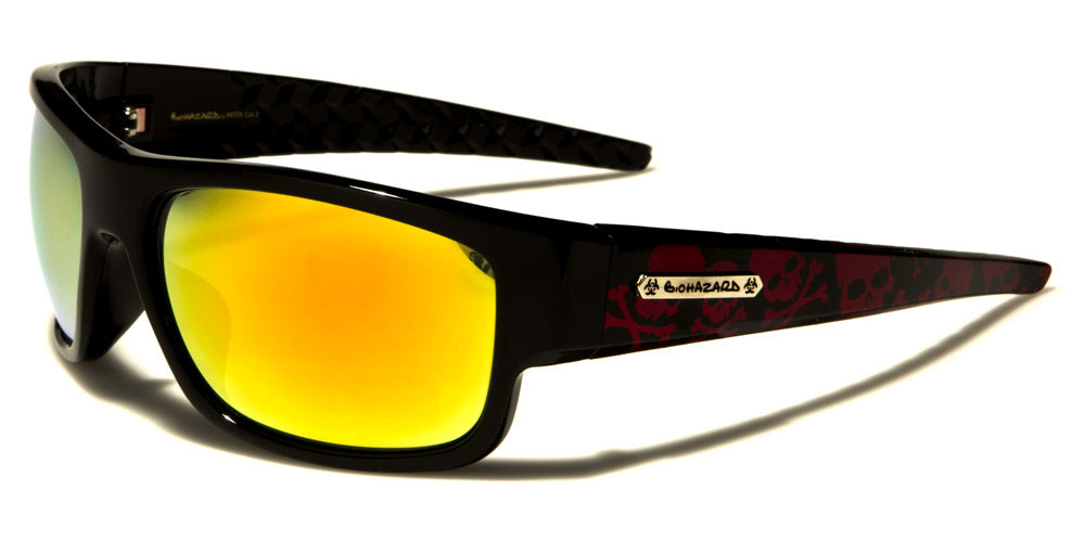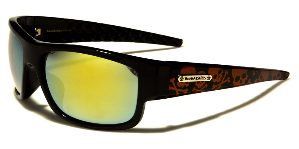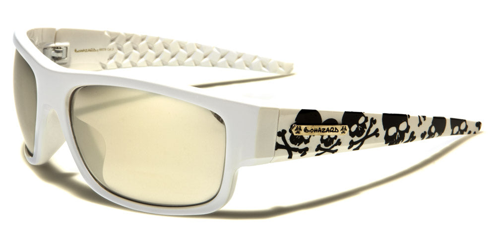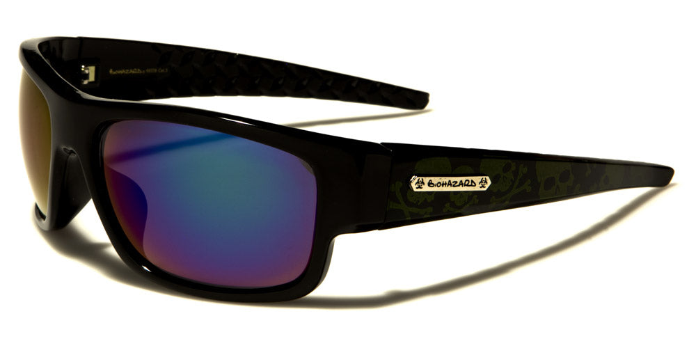 Depart from the usual with these men's Biohazard sunglasses. The edgy design features a skull pattern on the arms as well as a metal strip bearing the Biohazard brand name. Other details include a thick frame surrounding oval lenses, a pair of molded nose pads and gently tapered arms. The insides of the arms are textured for a comfortable and snug fit. Made of lightweight high-quality plastic, these sunglasses come in black or white, with smoke, revo orange, revo yellow, revo green, revo blue or silver mirror lenses. Meanwhile, the skull pattern comes in silver, red, orange, green, blue or black.