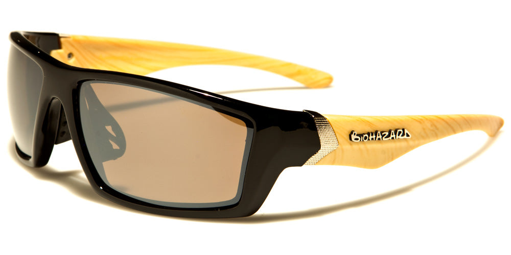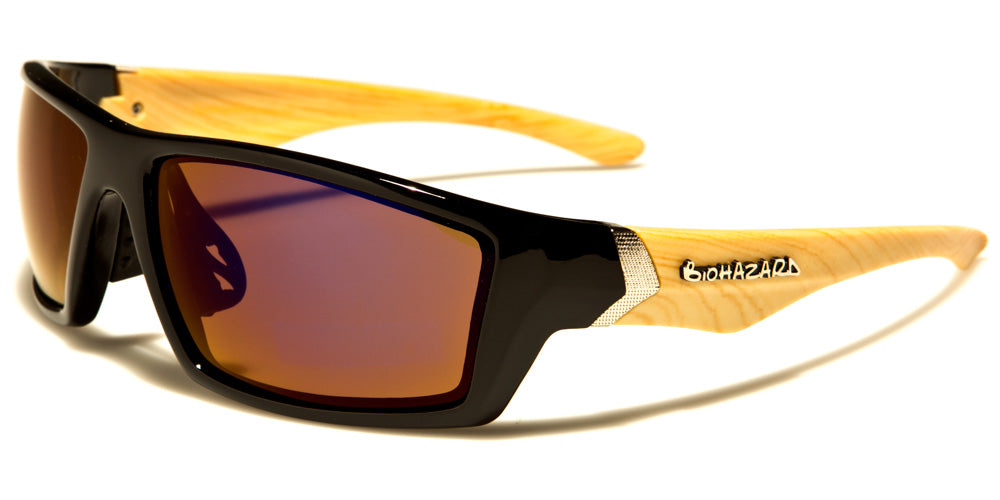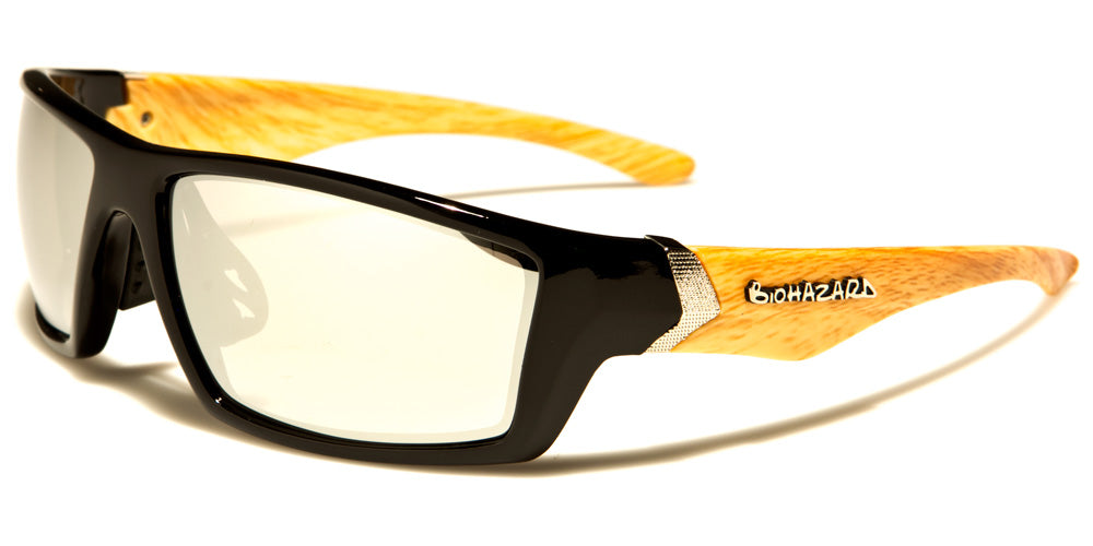 Men looking for a pair of bold, sharp sunglasses for everyday wear will love this pair from Biohazard. Thick frames around the lenses, a strong shark fin temple contour, and silver arrow accents along the arms combine to create these statement-making shades. The lenses are mirrored for maximum sun protection. Boxes of a dozen include black pairs, as well as additional color options with patterns along the arms.