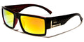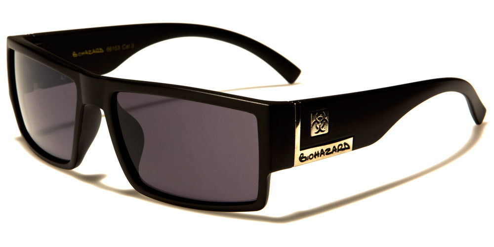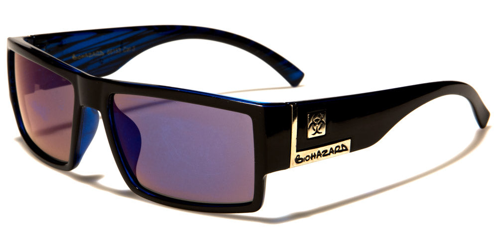These Biohazard square sunglasses for kids feature are made of plastic and feature smoke as well as color-mirror lenses with UV400 protection, which helps shield eyes from the sun's harmful ultraviolet rays. They are available with black frames and smoke lenses, black and red frames with revo orange lenses, black and green frames with green and purple lenses, and black and blue frames with revo blue lenses. These sunglasses are available in one dozen per box, which makes them ideal for retailers.