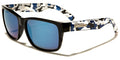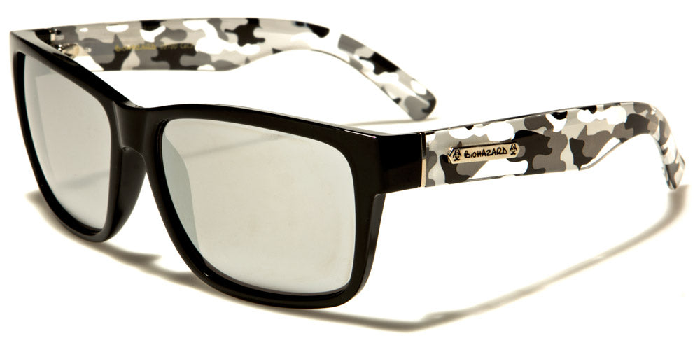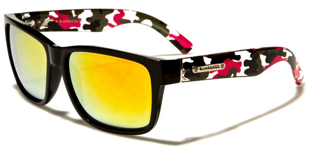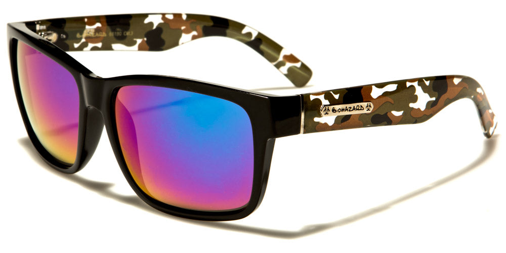 Wide, manly arms make these classic shades the perfect stylish choice for any guy. Sturdy plastic frames and mirrored lenses bring this classic style up to date. Wide arms angle in to long, curved earpieces. Arms are decorated with a metallic tag bearing the Biohazard logo. Choose from all black frames with dark lenses; dark brown frames with tortoiseshell details on the inside rims, nosepads, and arms, and brown lenses; black rims with black/gray/white camo arms and light lenses; black rims with black/white/red/gray camo arms and yellow arms; black rims with black/brown/white camo arms and multi-hued lenses; or black rims with blue/black/gray/white camo arms and blue lenses. These sunglasses are sold in bulk by the dozen.
