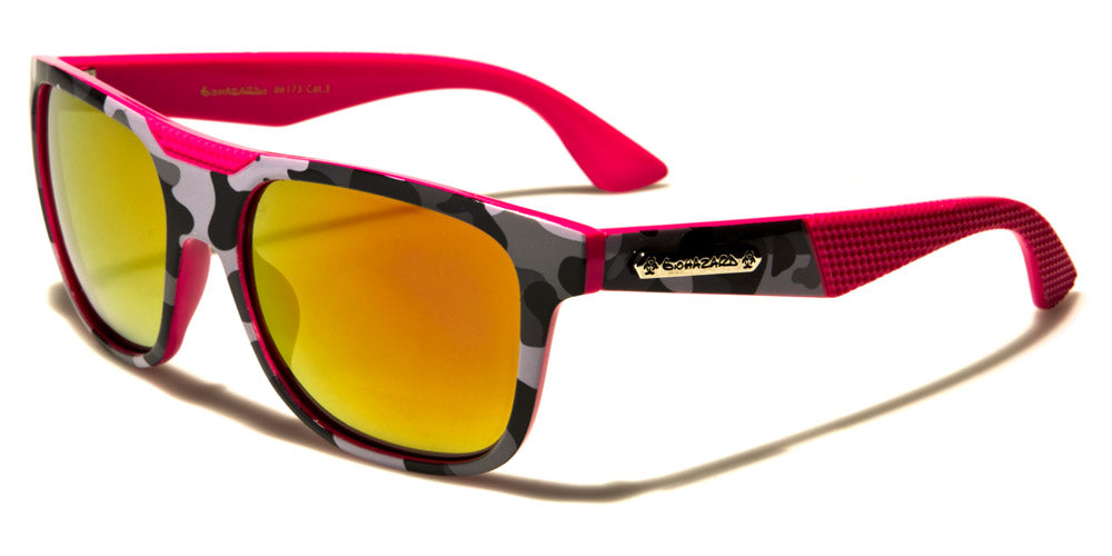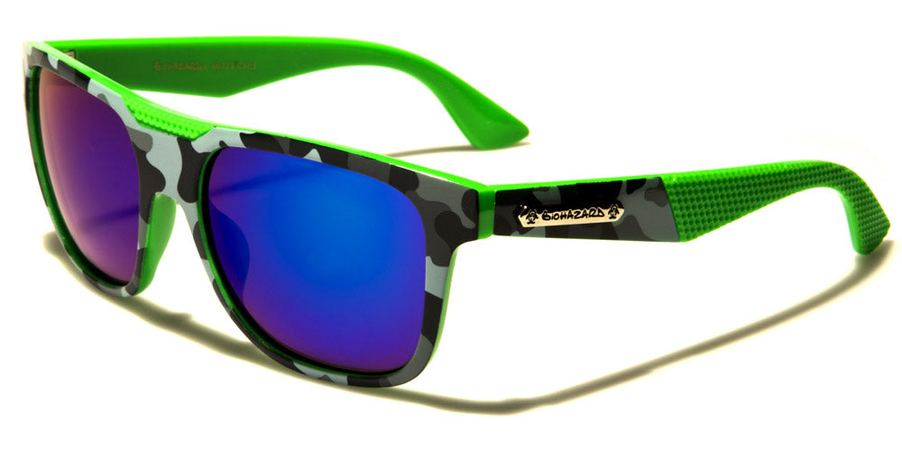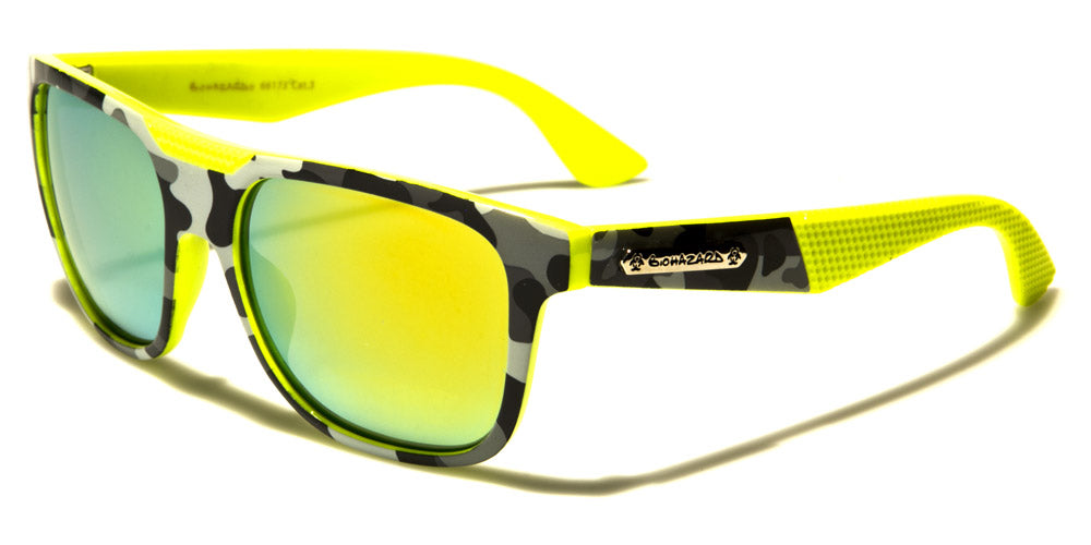 These Biohazard men's classic sunglasses feature plastic frames and mirrored lenses. Made using the highest quality UV400 protection, Biohazard helps ensure that eyes are protected from harmful UV rays. Colors include gray camo with white, pink, orange, yellow, green and blue on the frames and arms. The mirror lenses come in silver, revo orange, revo yellow, revo green and revo blue. The sunglasses are sold in bulk by the dozen.
