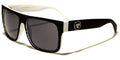 Sophisticated black pairs with each of the three primary colors or white in these chunky, fun retro shades. Ribbed black plastic covers the front face of the frames, with the accent color edging the top and inside of the frames (including the nosepads), the inside arms, and the hinges that attach the arms to the frames. Wide arms sport a round metallic biohazard symbol, and arms narrow abruptly into curved earpieces. Choose from all-black frames and arms; black with white accent; black with red accent; black with yellow accent; or black with blue accent. These sunglasses are sold wholesale by the dozen.