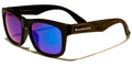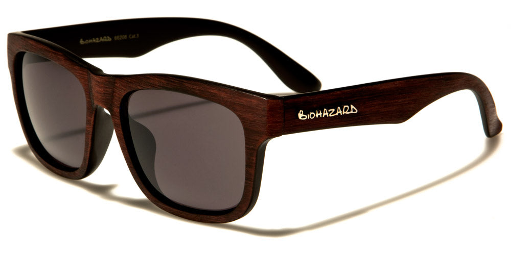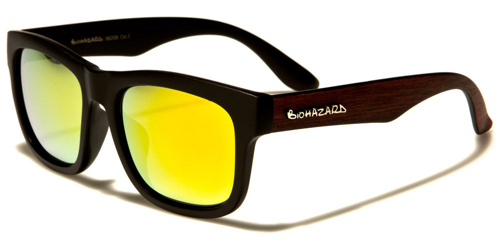Here's your chance to look stylish, sporty and eco-friendly. Faux wood grain on the face frames and arms of these otherwise traditional classic sunglasses provide a unique touch. Mirrored lenses are encased in plastic flat-front frames. Medium-wide arms angle sharply into curved earpieces and are decorated with a metallic Biohazard logo. Choose from gray-brown frames and arms with dark lenses; medium wood frames and arms with dark lenses; blonde-brown frames and arms with dark lenses; or turquoise frames and arms with dark lenses. Get a two-toned look with black frames and dark gray-brown faux wood arms with light lenses; black frames and medium faux wood arms with yellow lenses; black frames and blonde-brown faux wood arms with multi-hued lenses; or black frames with turquoise faux wood arms with dark multi-hued lenses. These sunglasses are sold wholesale by the dozen.