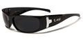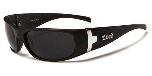 Rounded and solid looking, these nice sunglasses for men by Locs are shaped to fit comfortably and stay on no matter what you are doing. The frame is made of strong black plastic, and the interior curve of the frame helps the shades stay on and fit comfortably. The arms start thick and taper through a slight curve at the ear. The Locs logo is seen on the side in raised silver letters. The lenses are dark rectangles with rounded edges that block out the sun.
