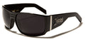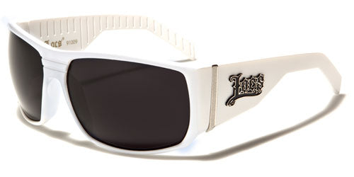 Check out these boxy and squared-off sunglasses by Locs for men. The frame features a solid look and feel with a shape that fits easily and a plastic construction that is rigid and stands up to daily use. The arms start thick and taper dramatically to a squared-off curve at the ear. The Locs logo is largely displayed on the side next to a silver vertical divider at the temples. The lenses are large rounded rectangles with a dark finish that protects your eyes from UV rays and gives you privacy.