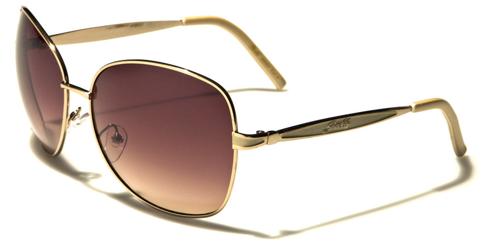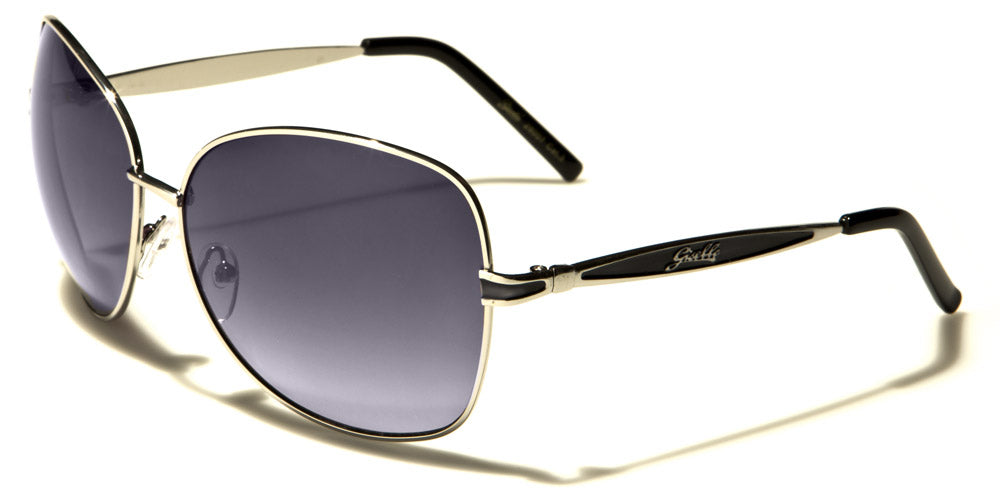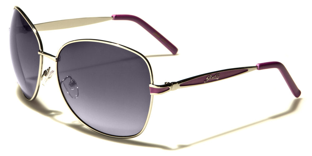 These fashionable women's sunglasses combine advanced UV protection with a metal butterfly-shape style. Featuring an oval lens, these wholesale sunglasses are easy to dress up or down. The Giselle logo is subtly and discreetly inscribed on the thin metal temple. Colors include black, brown, red, blue and purple. Featuring customizable nosepieces and earpieces, these sunglasses are easy to bend for maximum comfort and true-to-fit style. These sunglasses are similar to Aviator-style sunglasses, which makes them popular for mall kiosks, women's accessory stores, convenience stores and specialty department stores. Classic and timeless, these sunglasses remain in style year after year.