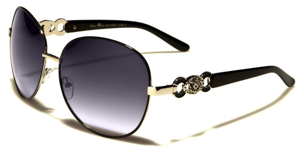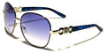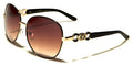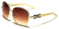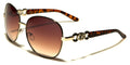 These stylish sunglasses by Kleo are designed for women seeking their own sparkling exclamation point. The frames are made of metal, and the arms are made of plastic, which gives them flexibility and strength without sacrificing comfort. The arms are decked out with design elements sure to require a second look from anyone passing by. The arms taper slightly to a curve at the earpieces. The lenses are oval in the butterfly style and offer both privacy and ultraviolet protection.