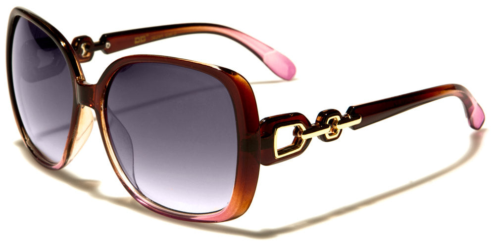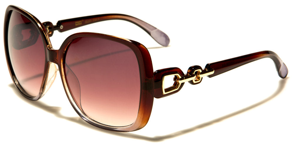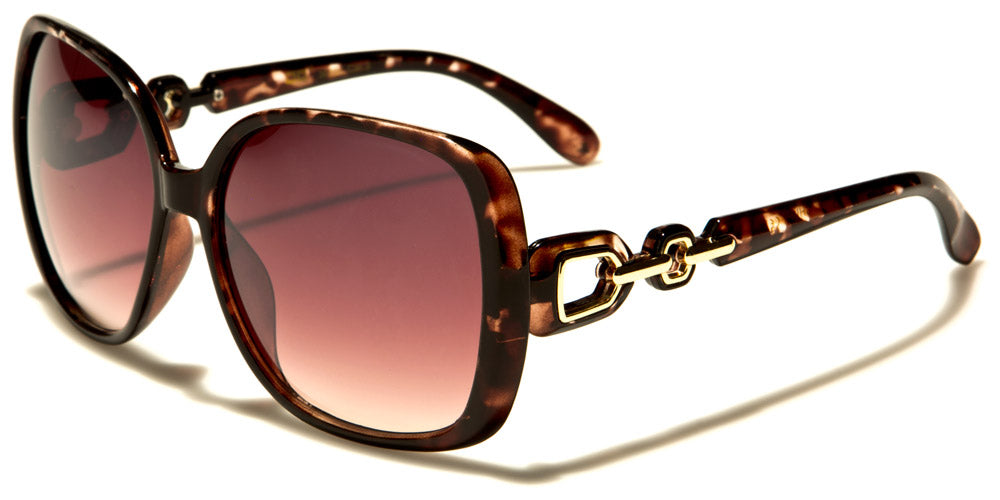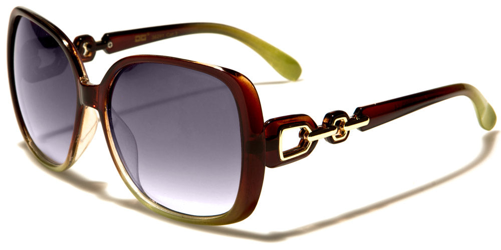 The arms are the key to the endless style of these butterfly sunnies - along with the sumptuous color: four metallic chain links surrounded in plastic culminate in solid elegant curved earpieces. At the front, the frame widens slightly at the outer edges for a slightly mysterious look. Your order will include a variety of the five distinct color/lens combinations available in this style, including: black frames, arms, and earpieces with black gradient lenses; brown frames that lighten to basil green on the bottom inner edges, brown arms, and brown earpieces that lighten to basil green at the tips, and black gradient lenses; medium brown frames that lighten to rose pink on the bottom edges, brown arms, and brown earpieces that lighten to rose pink at the tips, and black gradient lenses; brown frames that lighten to gray on the bottom edges, brown arms, and brown earpieces that lighten to gray at the tips, and amber gradient lenses; and dark tortoiseshell frames, arms, and earpieces and amber gradient lenses. These sunglasses are sold wholesale by the dozen.