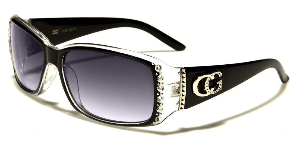 Packed with bling, these attractive sunglasses wholesale for women by CG are stylish and sparkly, demanding attention wherever you go. The frame is made of strong plastic and is available in different colors and patterns. The arms are straight with a gentle taper down to the curved earpieces. The CG logo is on the side encrusted with jewels, and the temples are encrusted with gems as well. The lenses are rectangular in shape and offer privacy and protection to your eyes.