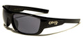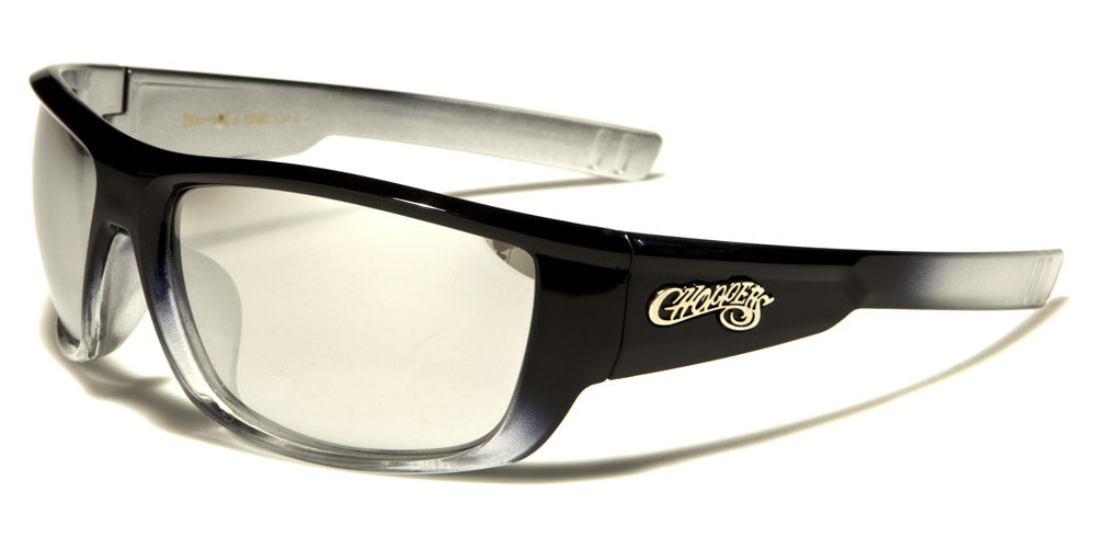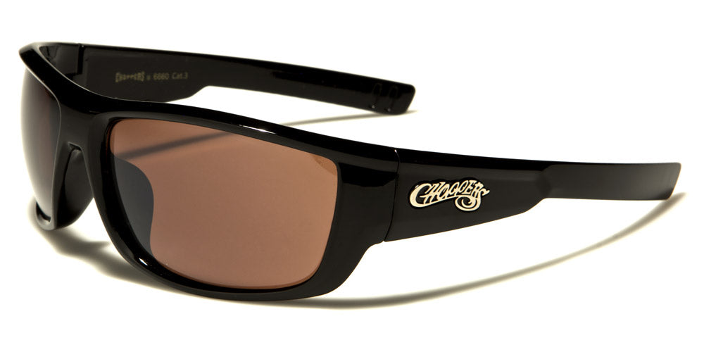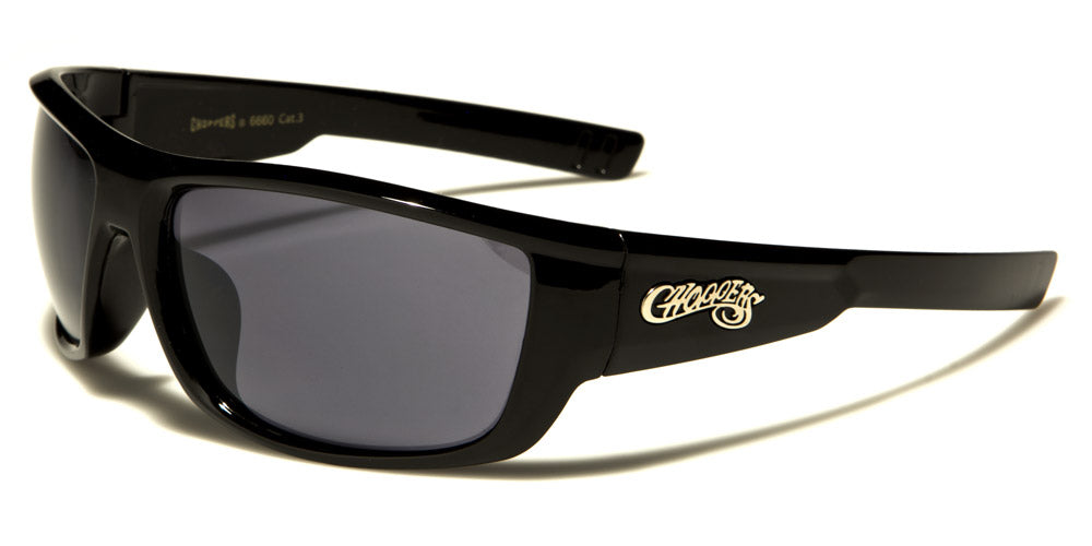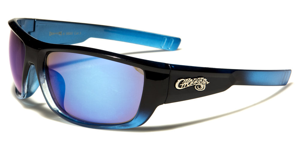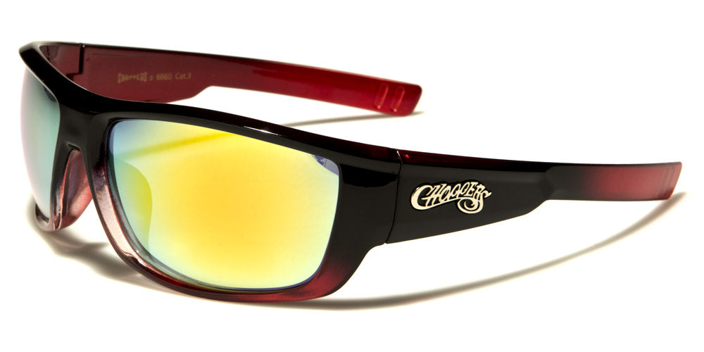 Solid looking and tough, these men's shades by Choppers are designed to be worn on the road to keep your eyes safe. The frame is made of strong plastic, molded to fit your head tightly and comfortably. The frames come in a variety of colors and highlights to suit your individual taste. The arms feature the Choppers logo on the side in silver script and are three-dimensional in shape. The lenses are rectangular with a mirrored finish and are available in several color options.