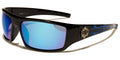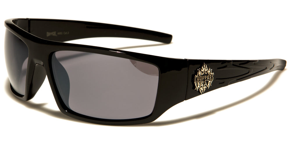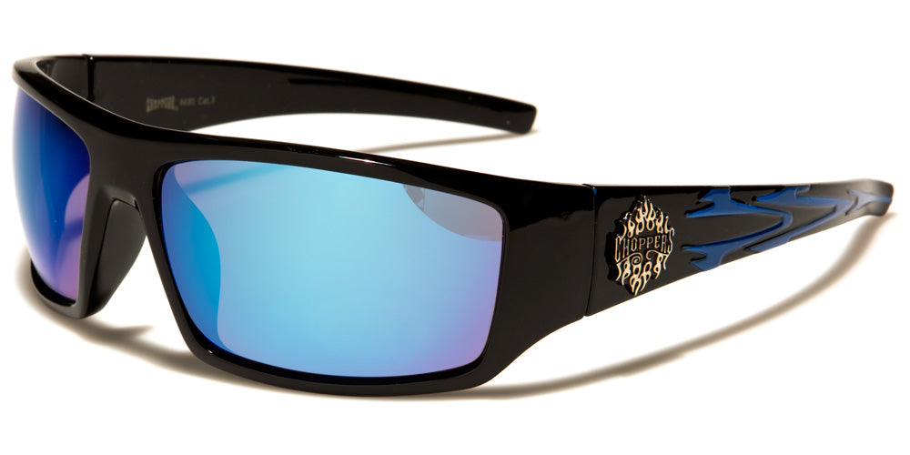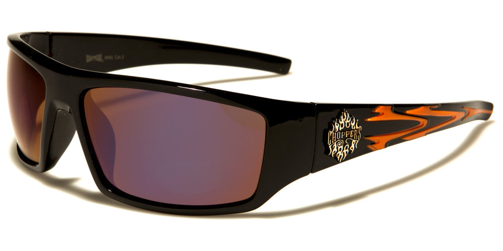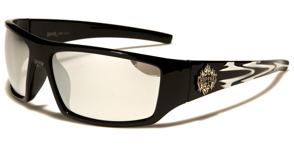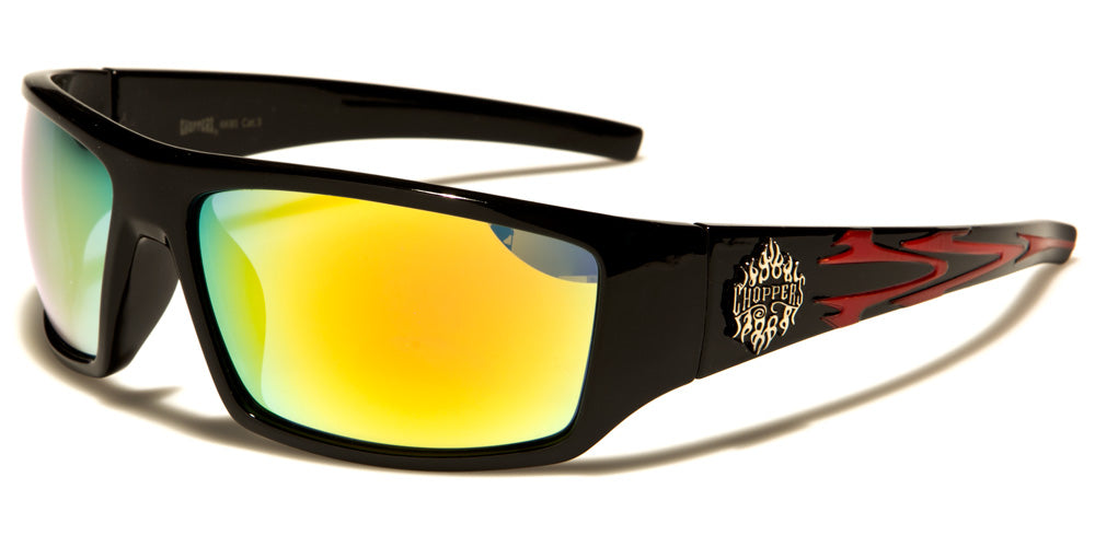 Get road trip ready with these attention-demanding rectangle sunglasses for men. A generous plastic frame encircles mirrored lenses to minimize the sun's unforgiving glare and keep you focused without strain. The wide set nose bridge allows for added strength, while the integrated nose rests help maximize comfort. The wide arms gently taper in a linear fashion, and feature wavy textured bands that embody the Choppers image. In addition, a shiny, raised Choppers logo roosts on the arm as a quality seal befitting of the brand. You won't want to start your next summer road trip without a pair of these! Each order contains an assortment of the color options pictured. This style is sold in bulk by the dozen.