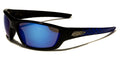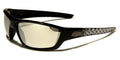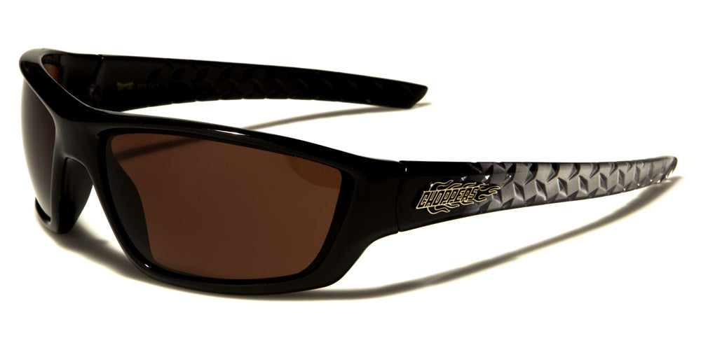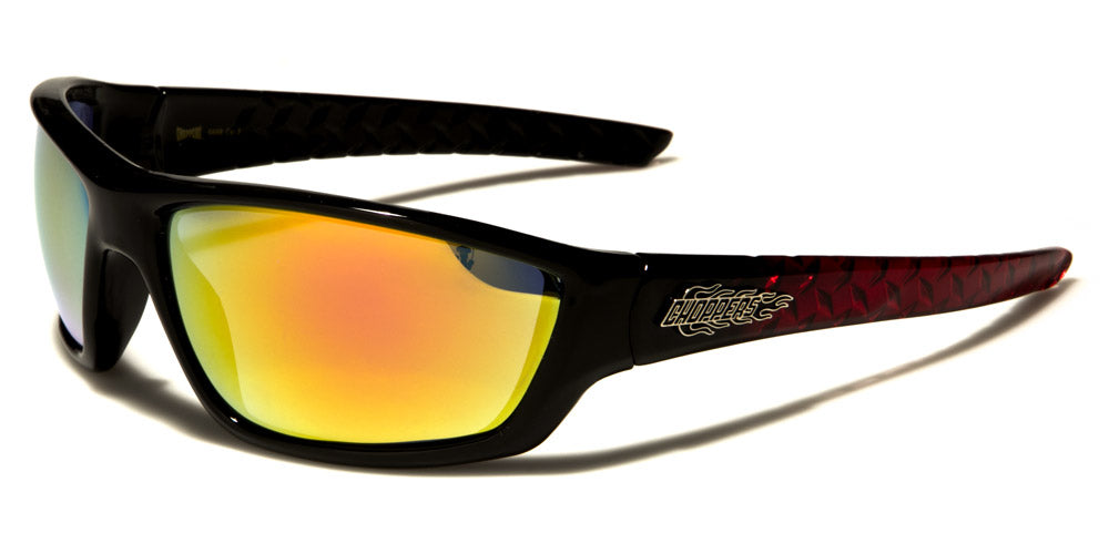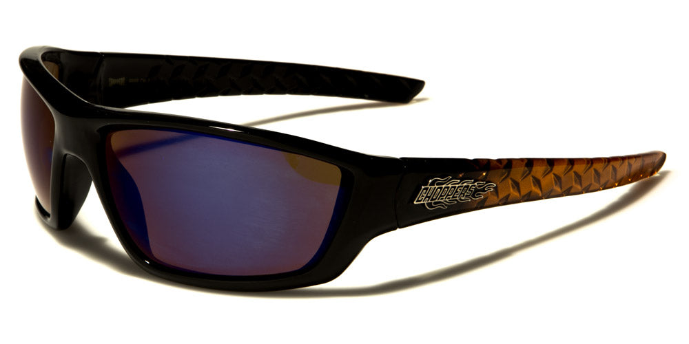 Set the trend with these Choppers men's sunglasses. These come with a rectangular design, a solid-black frame, a pair of molded nose pads and semi-thick and textured arms. The distinctive and fiery Choppers logo is prominently displayed on both sides of the temples with the stems bearing a textured diamond design. The UV400 lenses come in mirrored silver, revo orange, revo purple, revo blue and brown. Sold by the dozen, these sunglasses are made of high-quality lightweight plastic.