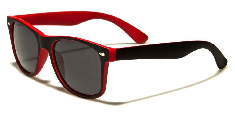 The frame features a soft rubberized finish, giving the sunglasses a comfortable matte texture that feels secure in the hand and on the face. The two-tone color design combines a black base frame with contrasting accent colors, creating a modern visual look while keeping the classic shape easy to wear across many outfits. Frames are made from durable plastic, helping maintain lightweight comfort while supporting everyday durability.