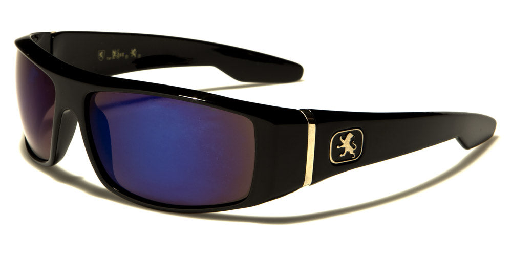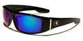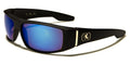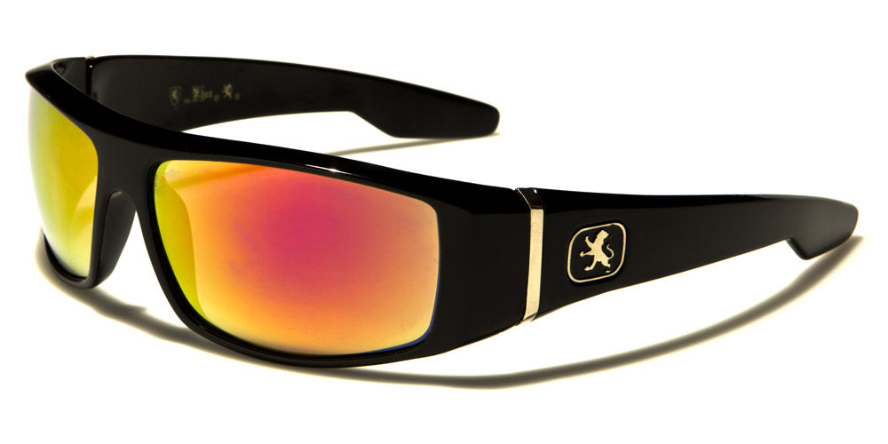 These Khan rectangle sunglasses are specifically designed with a masculine shape that highlights the male physique. Made of lightweight plastic, these sunglasses are ideal and practical for playing sports. The mirrored lens also makes them fashionable and anti-glare friendly. Color options vary and include black frames with gold and silver highlights as well as a Khan logo on the temples. Lenses include yellow, orange and red; yellow and orange; purple and blue; light blue; and dark blue and purple. These sunglasses are also fashion-forward, which makes them excellent for wearing with trendy polo shirts, khakis, trousers or sweaters.