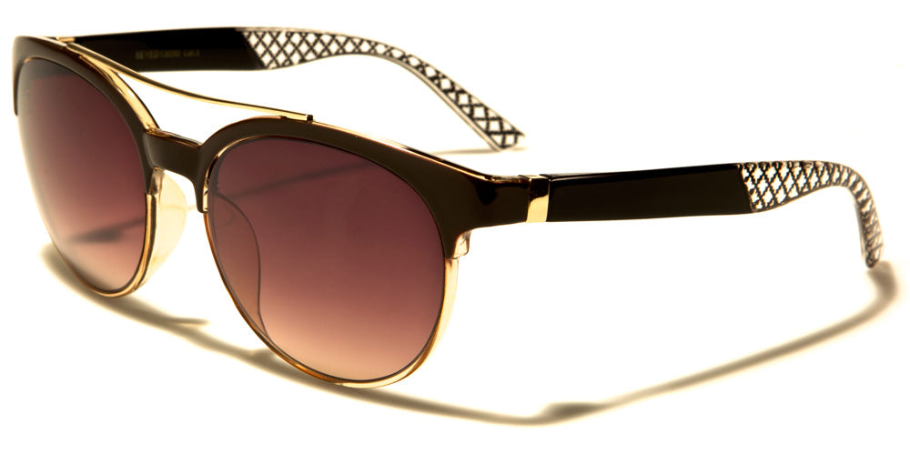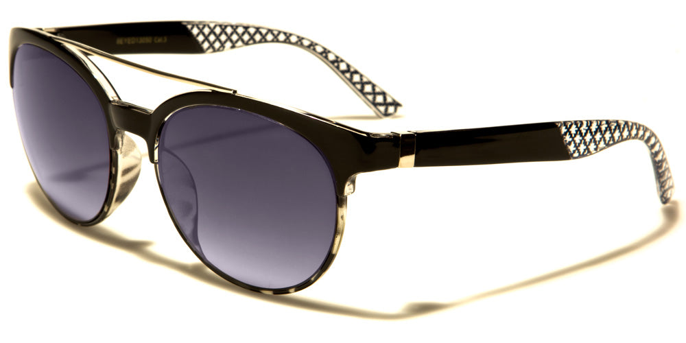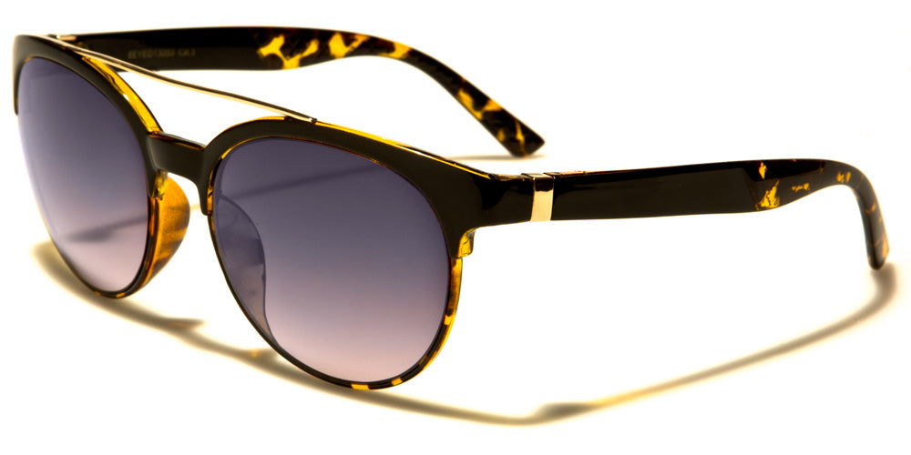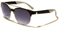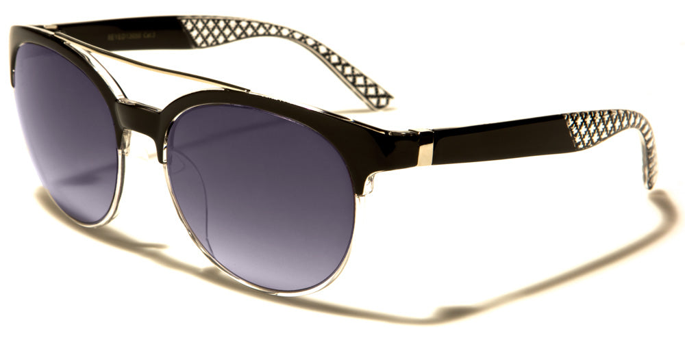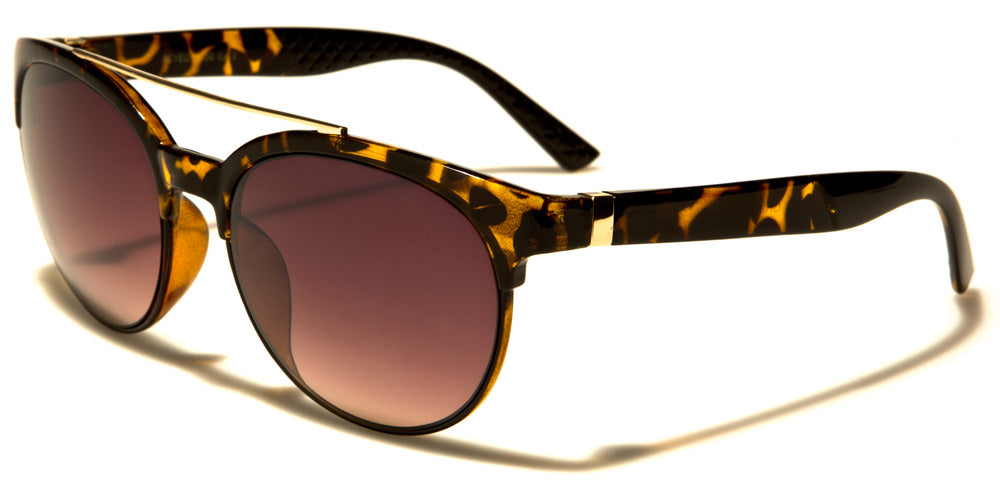 Thin plastic frames on the bottom and thicker plastic on the top of these round lenses add delicacy and substance to these adorable sunnies. A molded plastic bridge juxtaposes beautifully with a long wire top bar. The metal wire is echoed again at the hinges. Arms extend into sharply curved earpieces in a contrasting pattern/color - either a black and white houndstooth, animal print, or plain black. Varied frame color combinations with lens colors also add to the elegant overall effect. Each order arrives with a selection of all five color options available in this style. These sunglasses are sold wholesale by the dozen.
