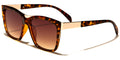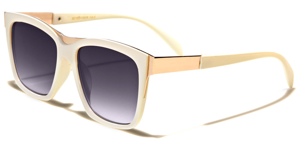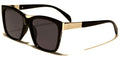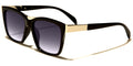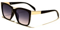 There is nothing shy about these stylized sunglasses. The squared-off shape of the classic rims is enhanced by the sparkle of metallic accents. Plastic frames include a gold metallic accent behind the bridge and wrapped around the topmost 1/4 of the outer edges. Short metallic arms attach to long, solid earpieces that narrow into the curve above the ear. Your order will arrive with a selection of each of the six style options, including: black rims and earpieces with black lenses; black rims and earpieces with dark gray gradient lenses; black rims and earpieces with medium gray gradient lenses; dark brown rims and earpieces with dark amber lenses; tortoiseshell rims and earpieces with dark amber lenses; and white rims and earpieces with black lenses. These sunglasses are sold in bulk by the dozen.