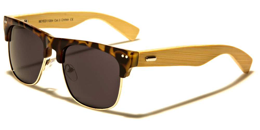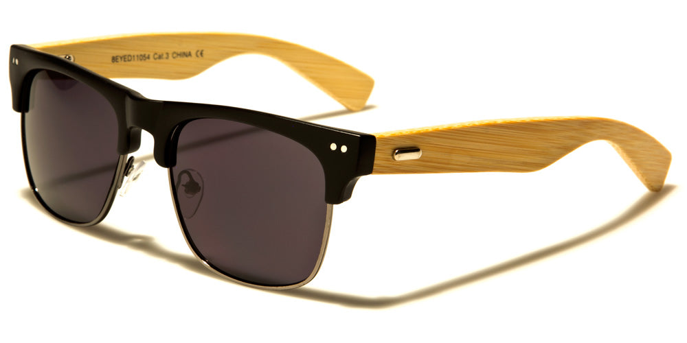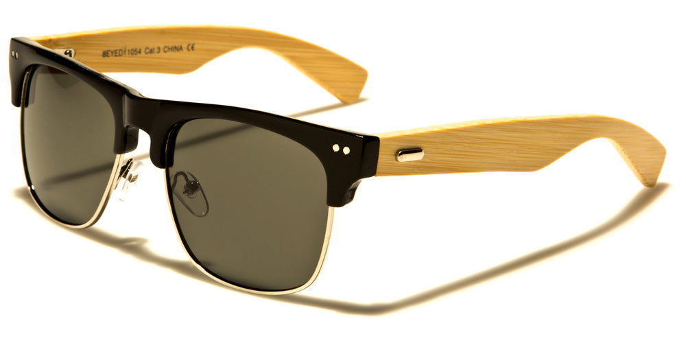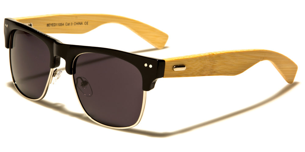 Both men and women will look smart in these super fun classic shades with wooden earpieces. Thin wire rims encircle the bottom portion of variously colored lenses, while strong plastic frames grace the tops. Two metallic pinhead details shine at the outer corners. Blonde wood arms are light enough to allow the wood grain to show, while a metallic oval detail adds sparkle to the temples. A high molded bridge and adjustable nose pads allows these appealing shades to sit comfortably on the face. Your order will include a selection of all five color options for this style. These sunglasses are sold in bulk by the dozen.