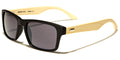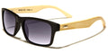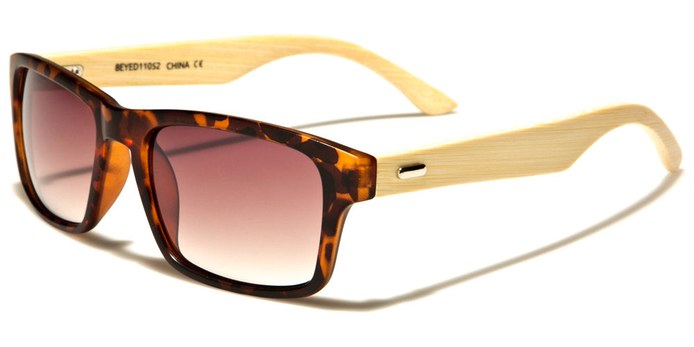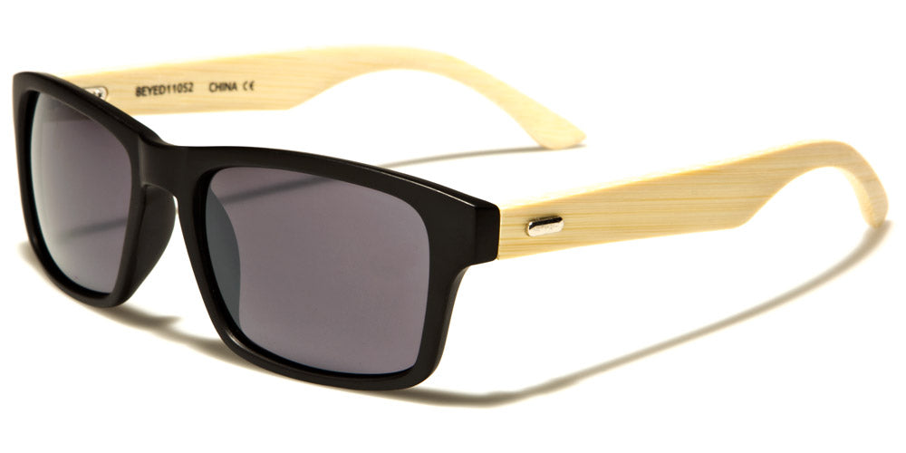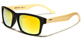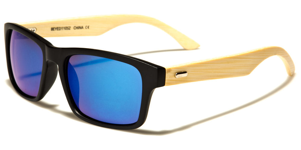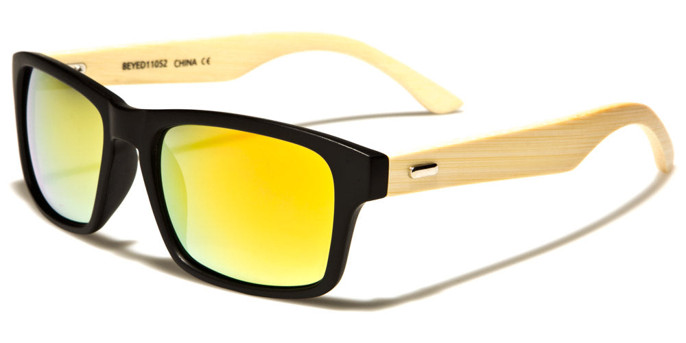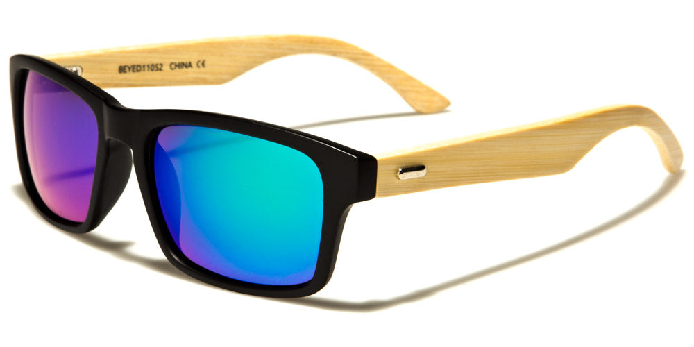 These Eyedentification classic sunglasses are nearly the same as the EYED11051 model; the exceptions are the color of the wood and the accent pieces at the temples. This design keeps the plastic frame up front and the wood on the sides, but the wood is a paler shade, making the grain less distinct. The front of the frames can also be tortoiseshell; the mirrored lenses come in gray, gradient blue, gradient rose, gold or blue.