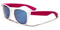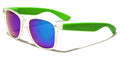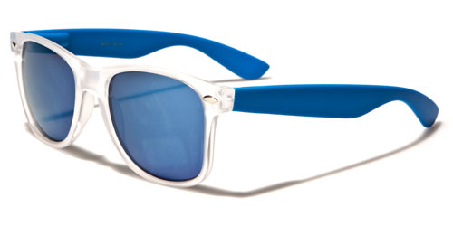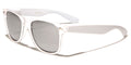 Classic glasses are made to draw eyes, and these cool shades go one step further with nice mirrored lenses. Then they go another step with either solid white arms or a wide variety of colors. The frame is made of plastic, strong and simple in design. The arms curve at the ear and are made to fit comfortably. The lenses are set in the flat face of the frame. The mirrored lenses protect your eyes from ultraviolet rays and give you privacy.