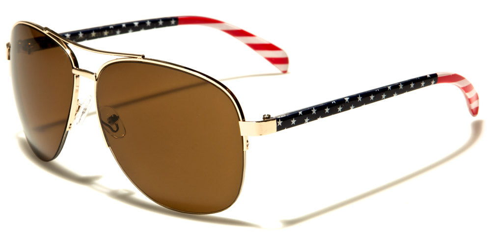 Show you patriotism the stylish way with these aviators that are ready for parades, fairs, vacations, and sporting events. Classic aviator lenses and wire frames get the all-American treatment with a set of arms and earpieces, which are attached to the frames via a metal hinge. Arms are star-spangled blue with red-and-white striped earpieces completing the tribute to the American flag. Choose from silver frames and dark gray lenses; silver frames and light gray lenses; gold frames and rose lenses; or gold frames and amber lenses. These sunglasses are sold in bulk by the dozen.