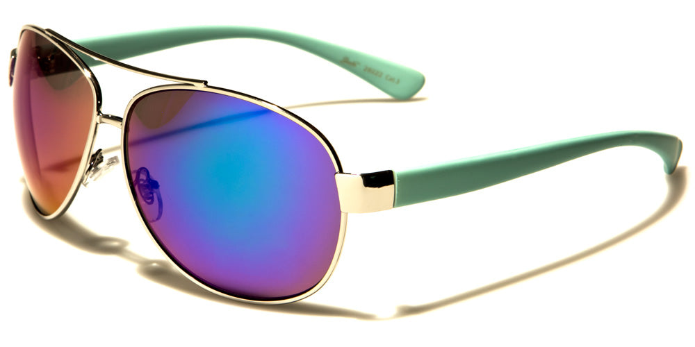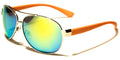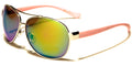 These mirrored aviator lenses are more rounded and curved than is traditional, giving these polished shades a modern edge. Wire rims with a double bridge keep the look classic. A metal hinge attaches to solid plastic arms that curve gently into earpieces. Sorbet arm colors add to the modern flavor of these shades. Your order will arrive with a selection of each of the seven options available in this style, including: black arms with medium-gray lenses; white arms with medium-gray lenses; orange arms with light yellow/aqua lenses; rose pink arms with dark yellow/multi-hued lenses; teal arms with dark multi-hued lenses; aqua arms with dark blue lenses; and grape arms with dark amber lenses. These sunglasses are sold in bulk by the dozen.