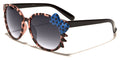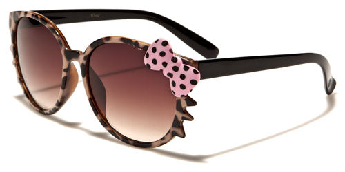 Take a cool pair of sunglasses with a nice animal print, add a cute polka-dot bowtie and you have a memorable pair of shades that any women would love to own. The frame on these beauties is made of plastic and shaped in the classic style. The arms are thin and straight with a curve at the ear. The front is flat with added lash-like protuberances on the sides. The gradient lenses protect your eyes and give you extra privacy.