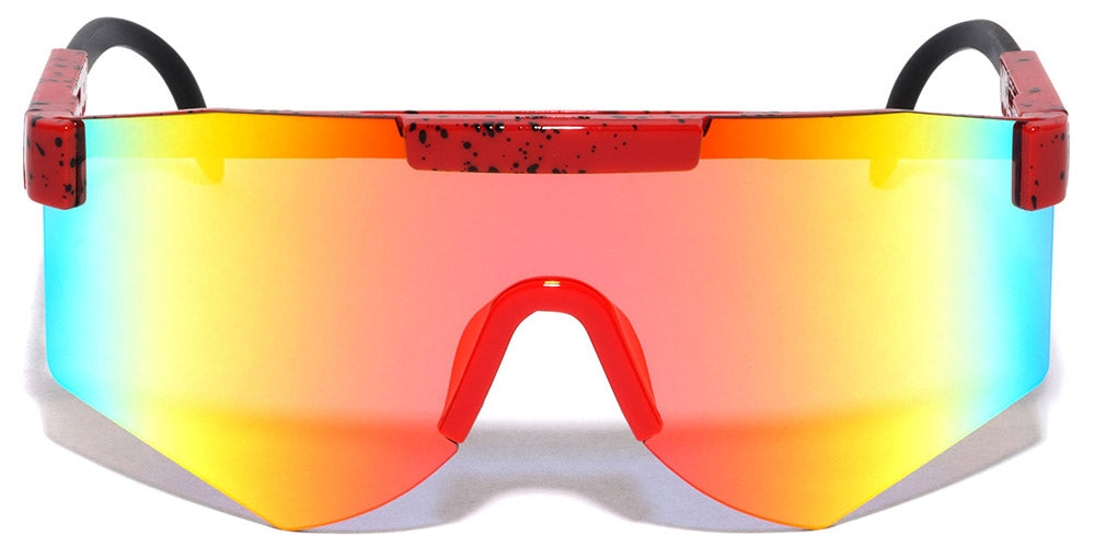 These ink splatter shield men's sunglasses are designed with a striking ink splatter pattern, which makes a bold statement while offering superior eye protection. The wide shield design provides extensive coverage, ideal for those men who appreciate both style and practicality. Made from high-quality plastic, these shades are lightweight yet durable, ensuring comfortable wear throughout the day. The distinctive shield shape not only enhances fashion quotient but also offers a modern, sporty look suitable for various occasions. Equipped with UV400 technology, these glasses block out 100% of harmful UVA and UVB rays, making them a smart choice for everyday use. Available for wholesale purchase by the dozen, each order includes a variety of the dynamic color options displayed.