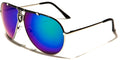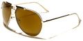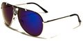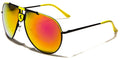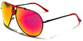 These Khan aviator sunglasses for men feature ultra-thin frames and arms in black, silver or gold. Colored strips adorn the top of the frames. The same color also wraps the ends of the earpieces. The Khan shield logo is boldly displayed on the bridge of the frame. The lenses come with a layer of reflective optical coating on the outside of the lens. The tint colors include amber and combinations of yellow/orange, orange/red and purple/blue. The lenses also feature UV400 protection.