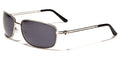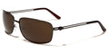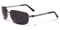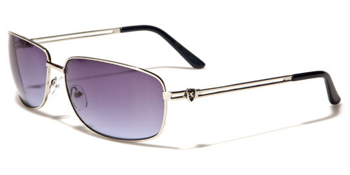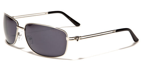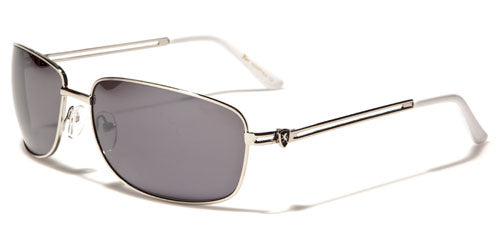 Sleek and slight of frame, these lightweight and simple sunglasses for men are designed by Khan. The frame is made of metal and is flexible and comfortable to wear. You can keep these shades on all day and never notice you're wearing them. The arms are thin with two horizontal bars that flow straight to the covered curve at the ear. The Khan logo is shown on the side as a small icon. The lenses are rectangular and are dark to protect your eyes from the sun and give you privacy.
