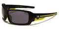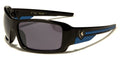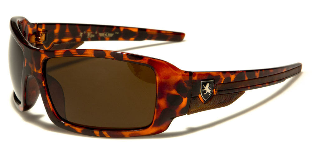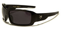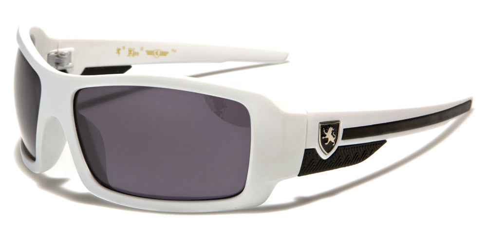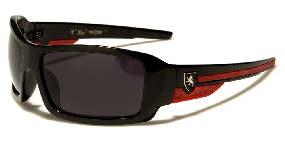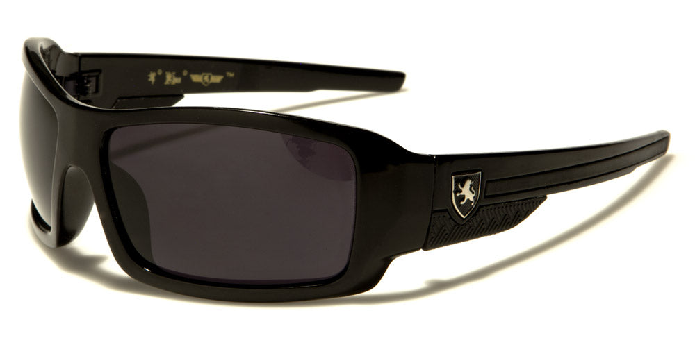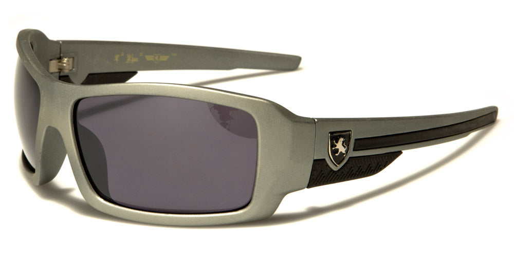 These bold rectangular sunglasses by Khan are designed for men who want to be noticed. The frame is a unique shape with rectangular lenses molded into a curving face with flowing arms. The arms come straight off the temples, then step down and flow straight back to the ear with several different texture elements. The Khan logo is embedded on the side highlighting this great brand. These shades are available in different highlight and frame color combinations in the dozen.