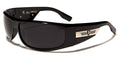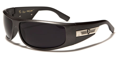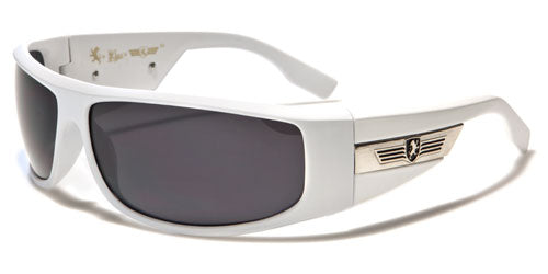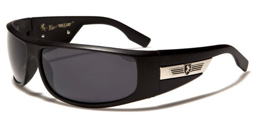 Nice looking wraparound shades that take your attitude to the next level. These sunglasses for men are designed by Khan, and their shape will keep them on your head comfortably no matter what you're doing. The thick frame is made of strong plastic, so it can stand up to rough treatment. The arms come straight off the face with several cool design features. The Khan logo is prominently displayed on the side. The lenses are rectangular and dark to protect your eyes from the sun's harmful rays.