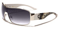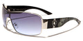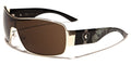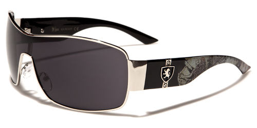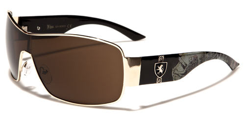Noticeable and stylish, these sunglasses for men by Khan are sure to get attention and will bring you compliments. The frame is made of metal, and the arms are made of plastic, designed to fit your head comfortably and to stand up to any kind of activity. The arms are thick with the Khan logo and a cool design pattern along the tapered curve at the ear. The lenses are large and dark, and they flow together in the middle with adjustable nosepieces for better grip.