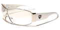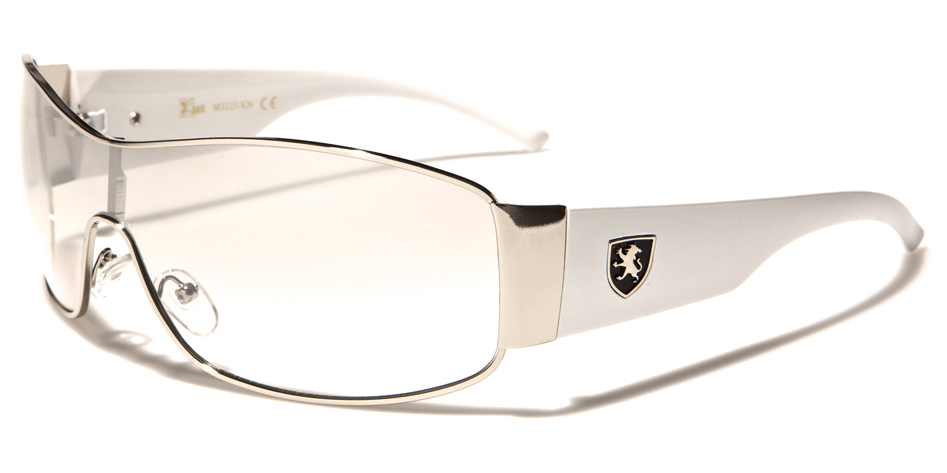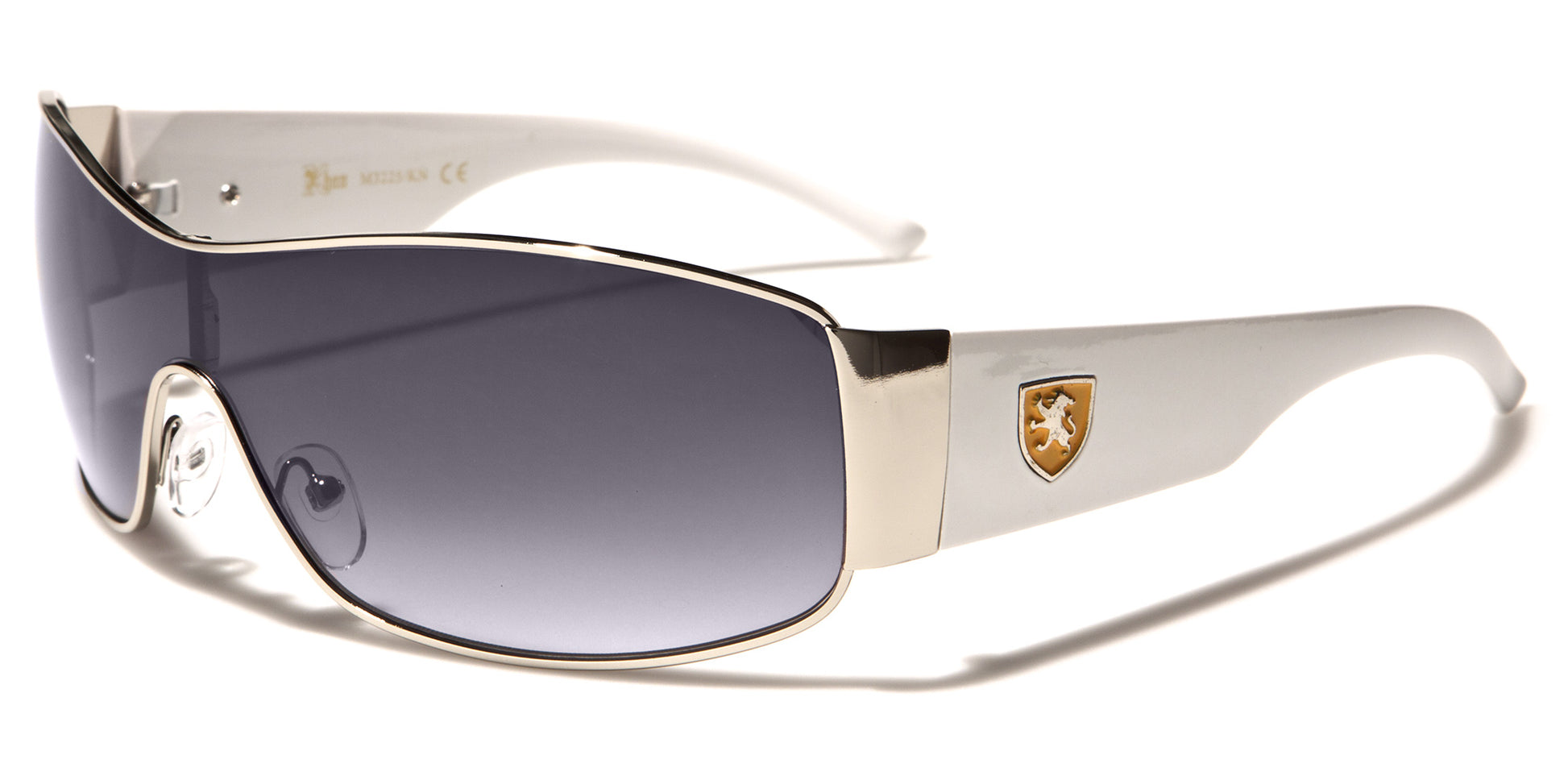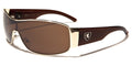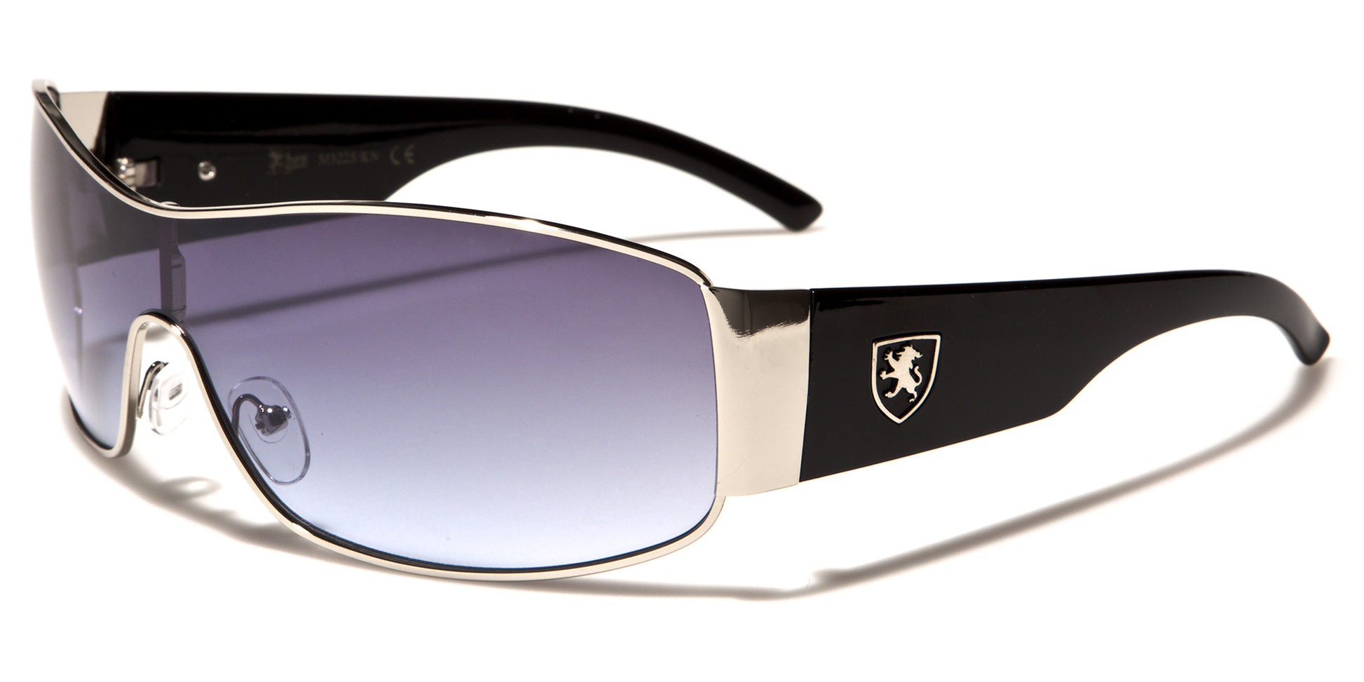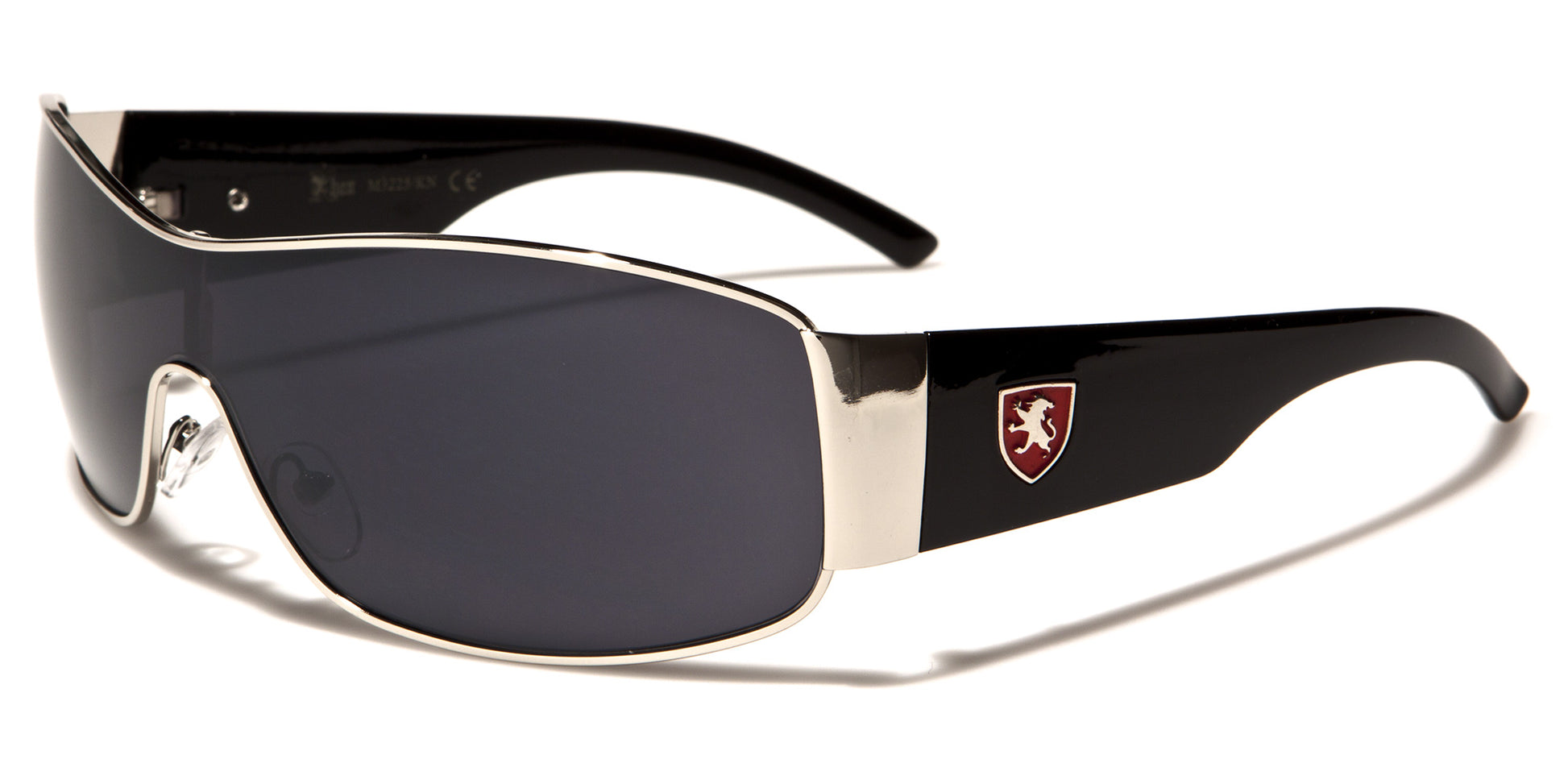 Dark and mysterious, these cool sunglasses by Khan are made for men and women who want to exude an air of style and attitude all their own. The shades are metal and plastic, made to be tough and rigid, but also flexible and comfortable to wear. The arms start thick and taper around a curve to the ear. The Khan logo is seen boldly on the arms. The shield lenses are dark enough to give you privacy and protect your eyes from ultraviolet rays.