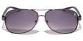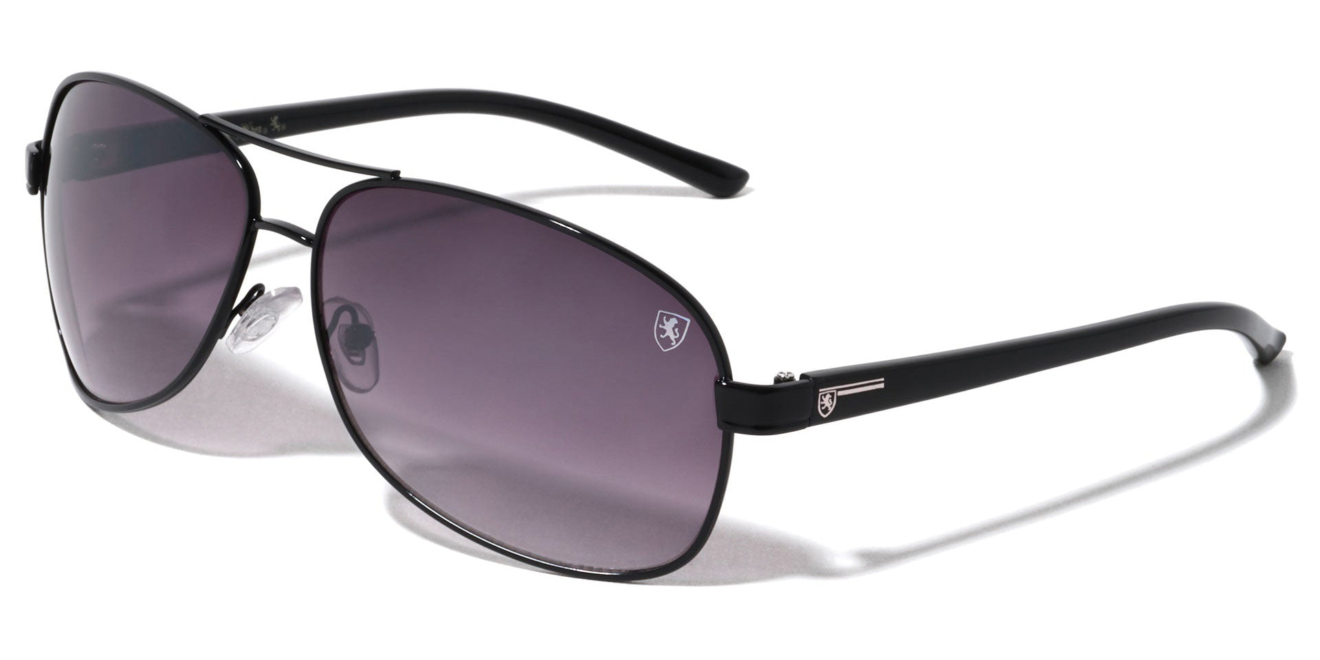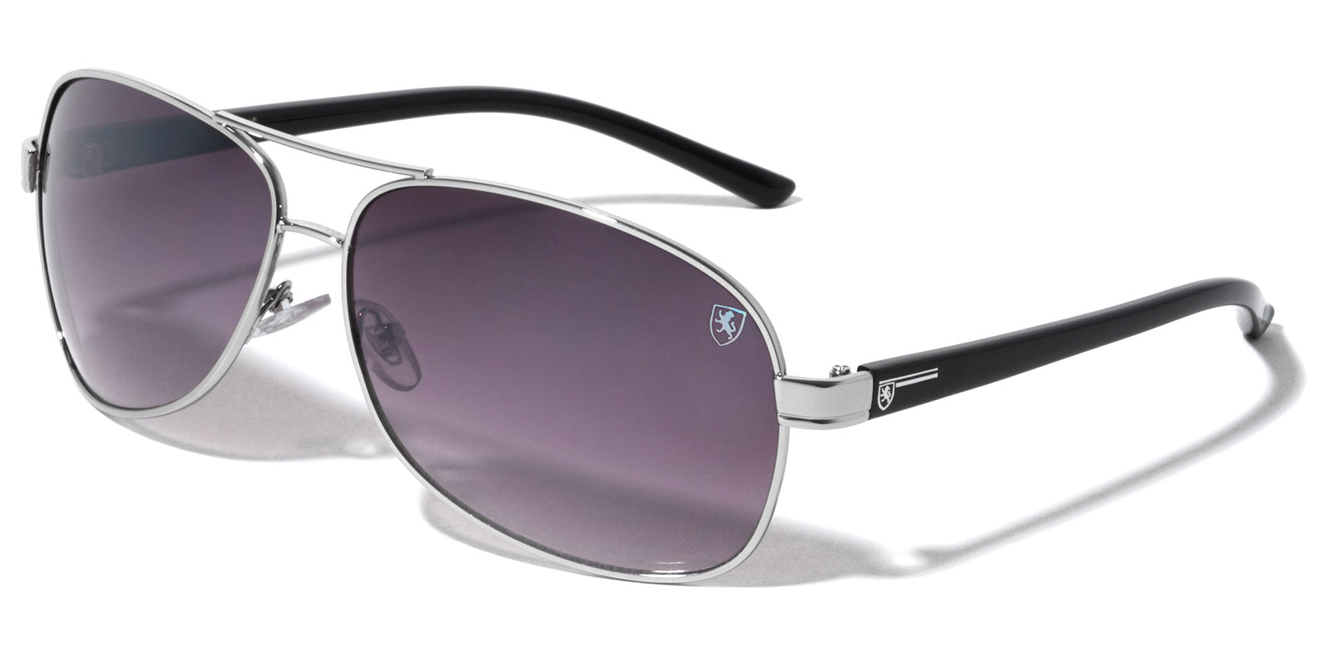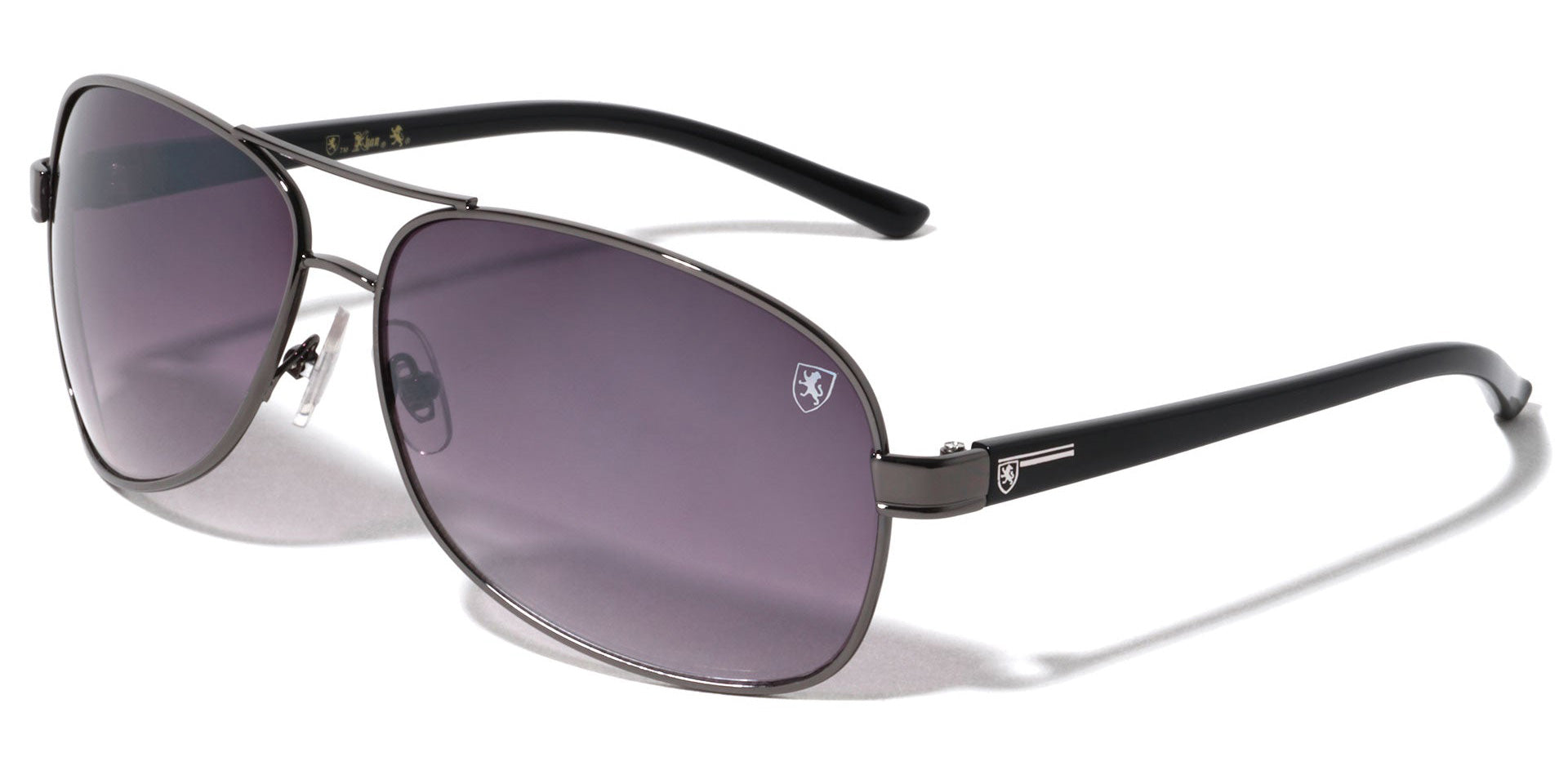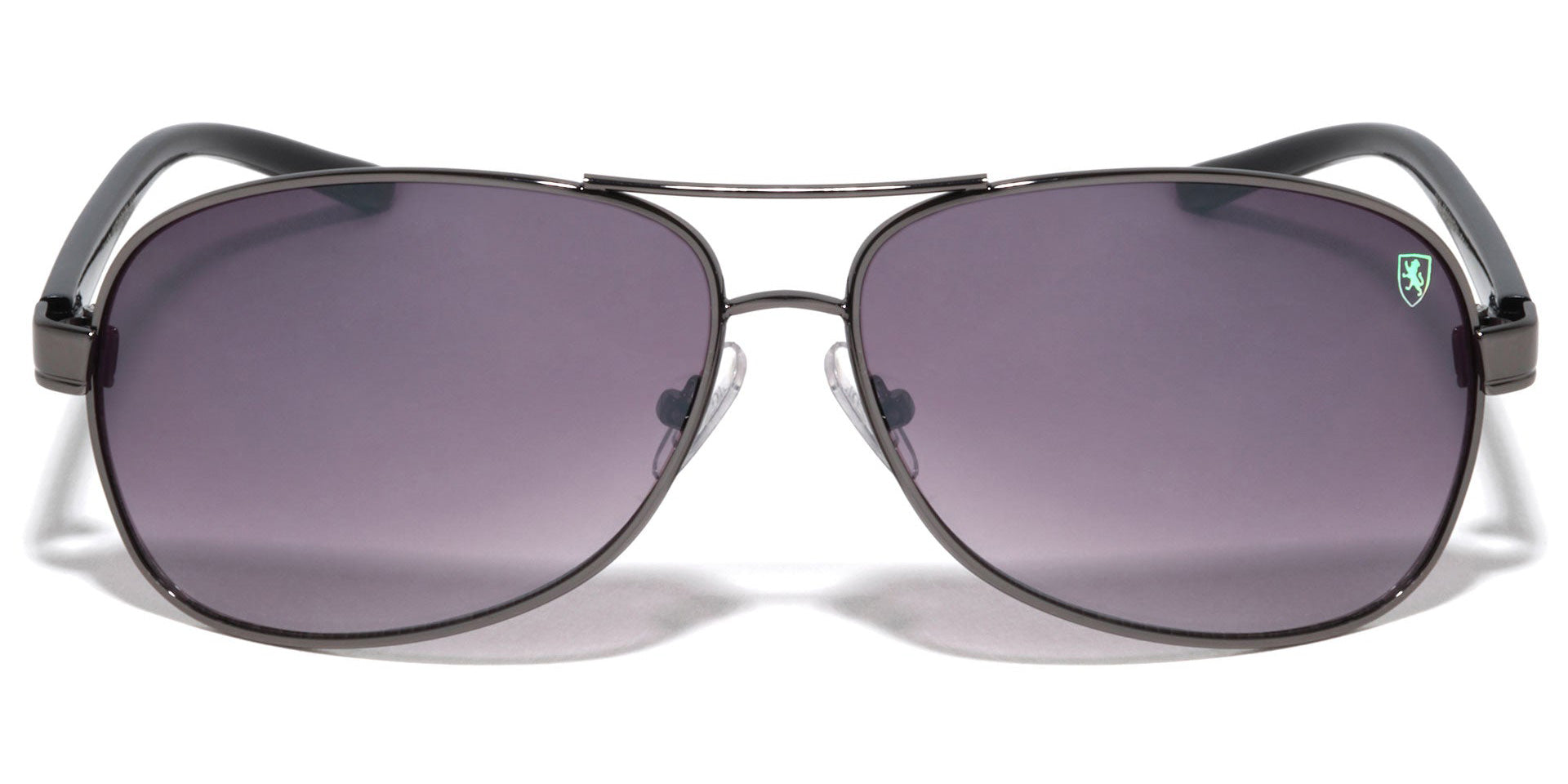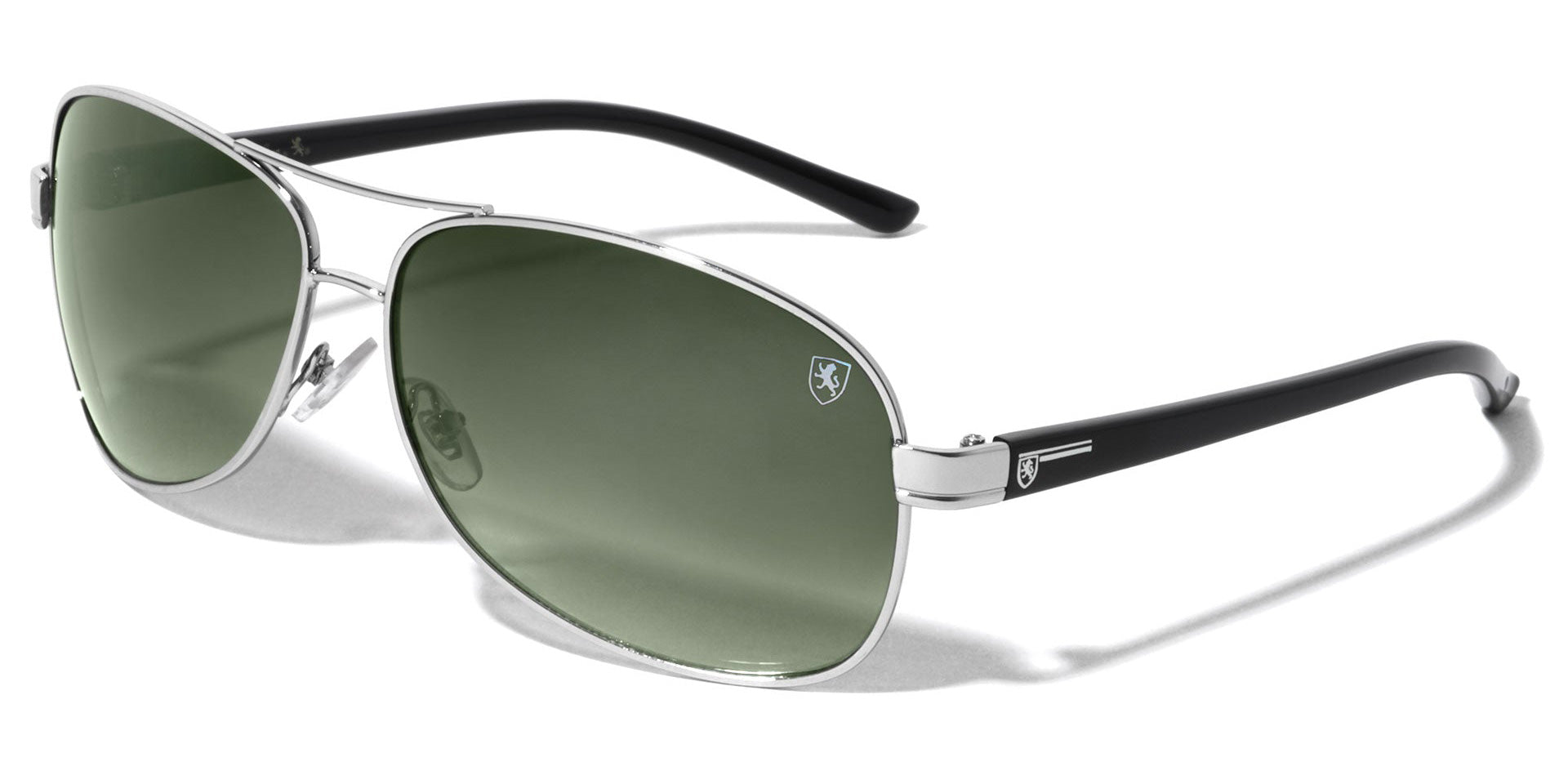 A classic never goes out of style and with pretty good reason! These aviators are a perfect example. These Khan bulk sunglasses feature movable transparent nose pads, slightly curved double bars at the nose, hinged stems, full rims that feature a thin strip of metal and straight, slim plastic stems. The stems are almost straight, except at the tips where they curve slightly to make a comfortable fit over the ears. The Khan insignia of a shield with a rearing lion inside can be found in the upper left corner of the left lens. The frames come in black, gunmetal and silver, and the frames are gray, green and brown.