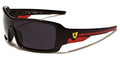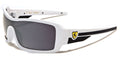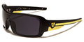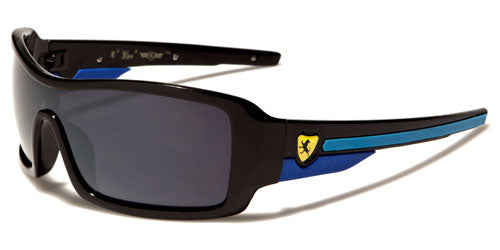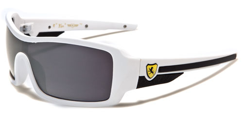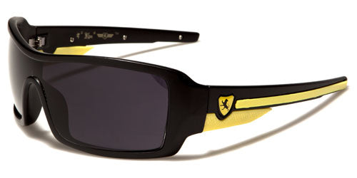 These ultra-cool shades by Khan are designed for men who want to show off their individual flair and attitude. The lenses are rectangular in shape and flow together in a shield style. The lenses offer extra protection from the sun as well as extreme privacy. The frames are made of thick plastic, giving the sunglasses a bulky and solid appearance. The arms sport the Khan logo in black and yellow and a racing stripe down the side. Several color combinations are available in the dozen.