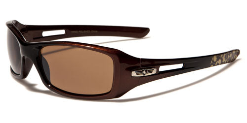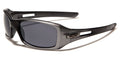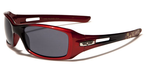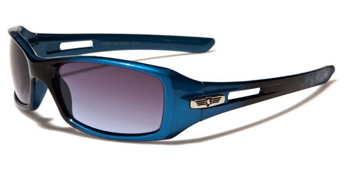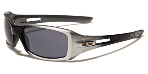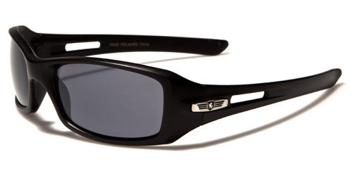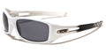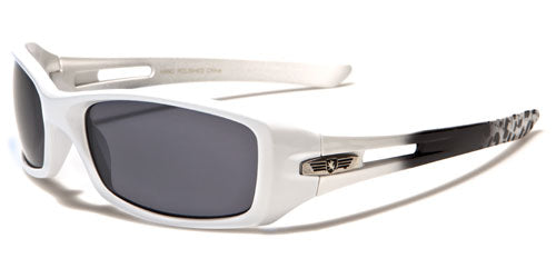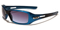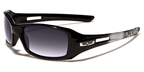 Check out these cool shades by Khan that are designed for men who want to show off their own style with flair and attitude. The frame is all plastic, bold until you get to the middle of the arms where a powdering and then a cool design take over. The arms show off the Khan logo as well against a horizontal silver stripe. The lenses are small and dark in a rounded rectangle shape. The lenses block ultraviolet rays and give you privacy.