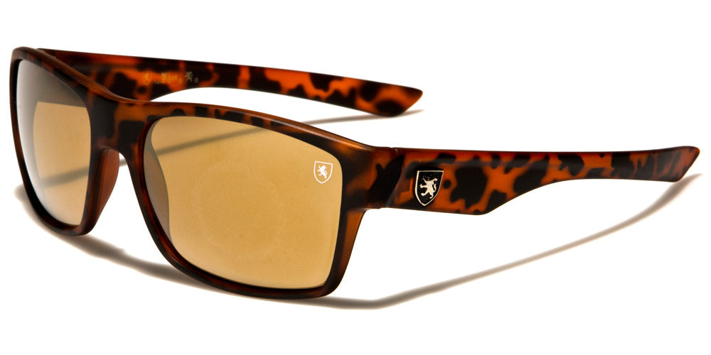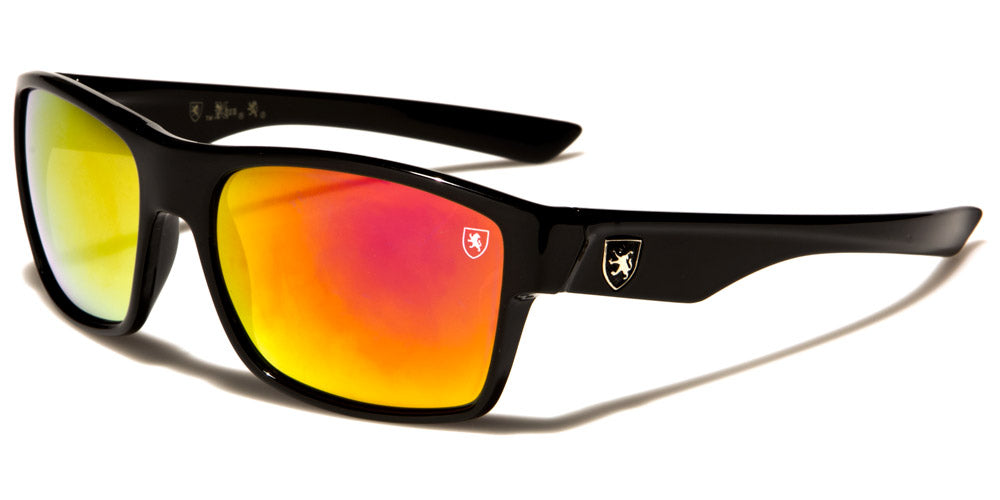 These men's Khan rectangular bulk sunglasses are sophisticated and glamorous. They feature a Khan logo in the upper corner of the left lens as well as on the arms in black, yellow and red. Frames come in black, translucent gray and brown tortoise, and lenses come in revo orange, revo green, revo blue and brown. These sunglasses also feature UV400 protection, which provides eyes with the most intense protection of all.