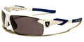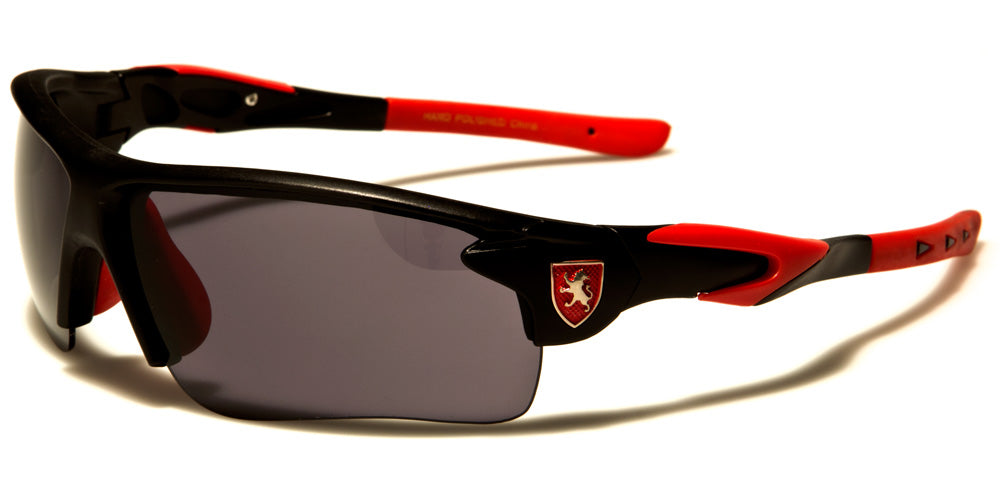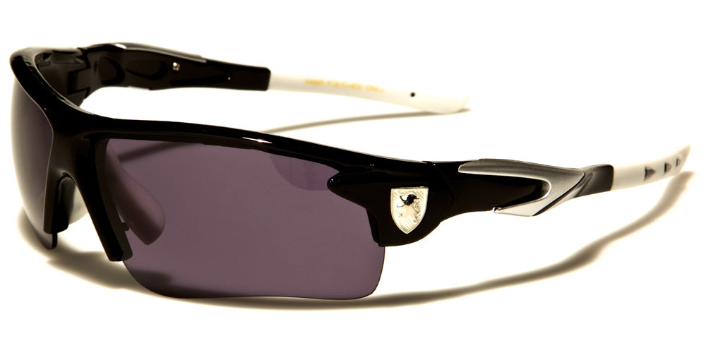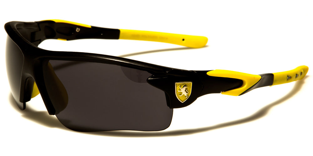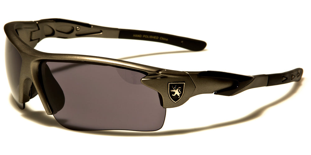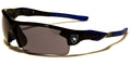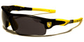 Nothing says sports glasses like these streamlined Khan shades built for action. Semi-rimless lenses and frames wrap around the head for stability during physical activity. A molded bridge and nose pads adds further comfort. Highly textured arms include bright color accents, including a metallic Khan logo shield. Earpieces include three triangular tabs for interest and texture. Each order arrives with a selection of all six color options available for this style. These sunglasses are sold in bulk by the dozen.
