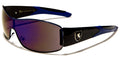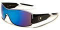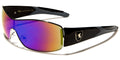 Mirrored shield lenses work hard to protect your eyes and reduce UV exposure. These shield lenses are outlined with a metal frame and include comfortable nosepads. Wide arms hug the head and taper gently into straight earpieces. Arms are decorated with the Khan logo and an accent color, as are the frames above the lenses. Choose black frames with red accents and light lenses; black frames with yellow accents and light lenses; black-on-black frames with purple lenses; black frames with white accents and blue lenses; or black frames with blue accents and brown lenses. These wholesale sunglasses are sold in bulk by the dozen.