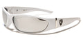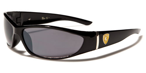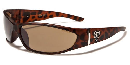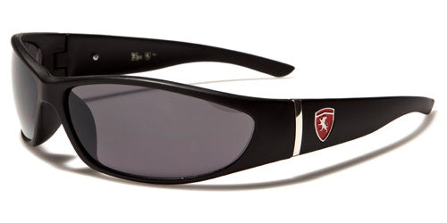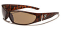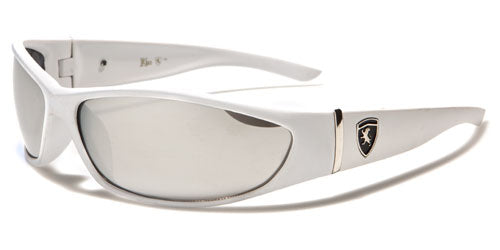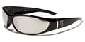 Look good no matter what you're doing with these smooth sunglasses by Khan designed for men. The frame is made of strong plastic, intended to hold up to the most active lifestyle. The overall shape is thin and flowing, and the frame will fit comfortably and stay on your head. The arms are thick with a tapering curve at the ear. The Khan logo is featured on the side next to a vertical silver divider bar. The lenses are curved rectangles with a dark finish.