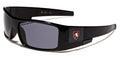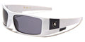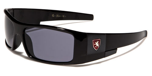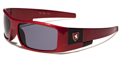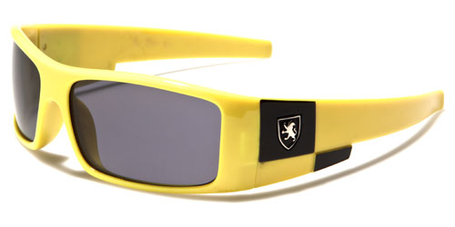 These futuristic looking shades for kids are made by Khan. The frames are tough and durable plastic, designed to be lightweight and fit comfortably. The arms feature the Khan logo in silver against a colored field. The arms start thick directly from the temple and taper slightly to the inward curving earpiece. The lenses are rectangular and offer ultraviolet protection to young eyes. These great sunglasses are available in an assortment of colors, from yellow to blue, in bulk quantity.