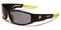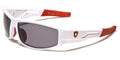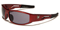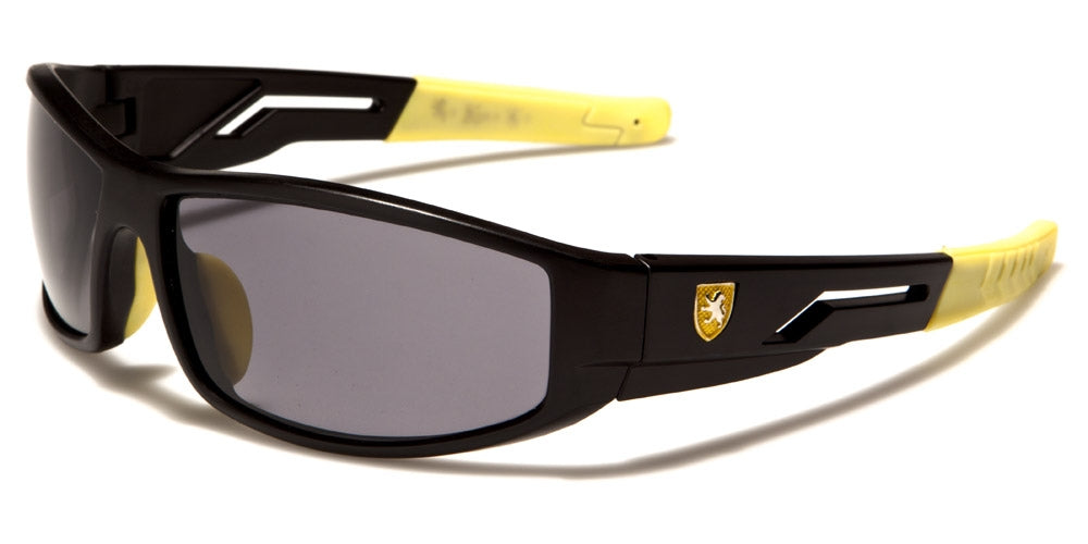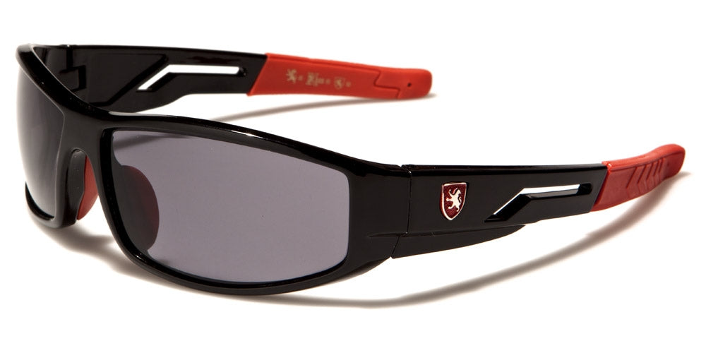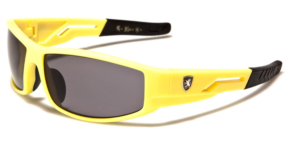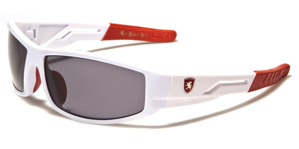 These great two-tone sunglasses for kids are designed by Khan and made to stand out in a crowd. The frames are made of plastic and feature earpieces and nosepieces of varying colors to accent your kid's bright personality. The arms show the Khan logo on the side and have a cut out section to add to the style of the shades. The lenses are rectangular and have a smoke finish to add extra privacy, mystery and ultraviolet protection. Choose from many different color combinations.