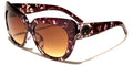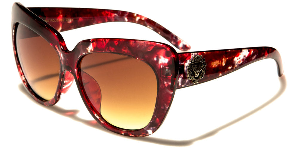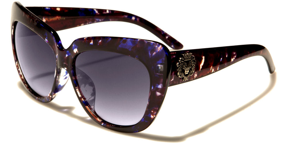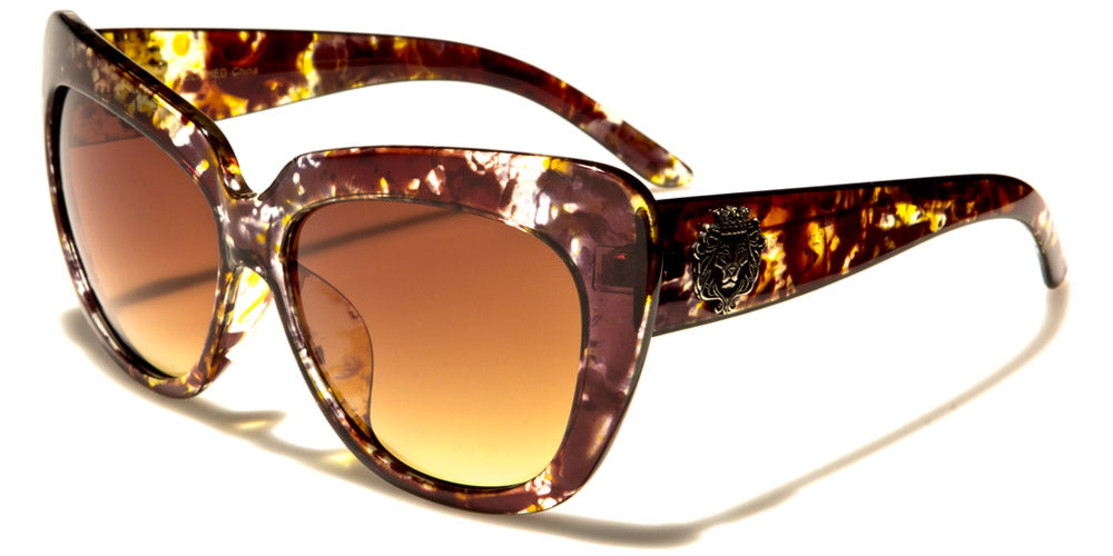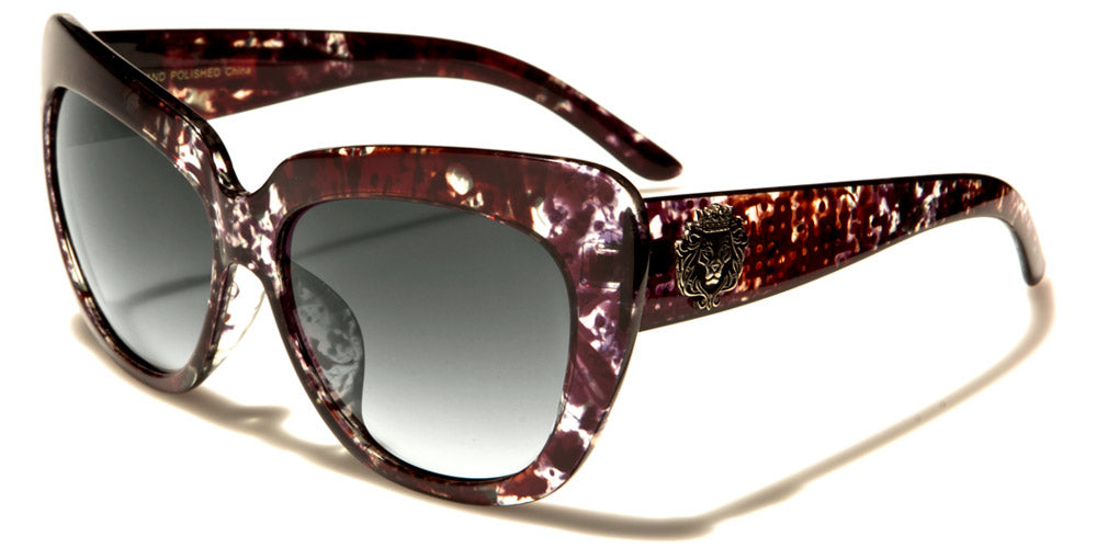These Kleo women's cat eye sunglasses feature UV400 protection and offer the ultimate in glamour. They highlight the telltale Kleo logo on the arms and feature the following color choices: gray tortoise print with gradient smoke lenses, burgundy multi-print with green lenses, purple and brown multi-print with gradient smoke lenses, red multi-print with gradient brown lenses, brown multi-print with gradient brown lenses, and purple multi-print with gradient brown lenses.