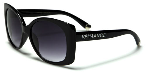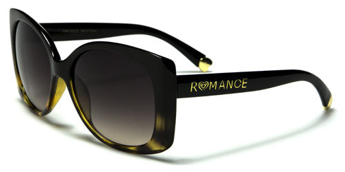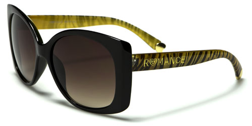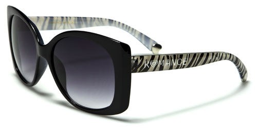 Show off your penchant for romance and animal prints with these ladies' Romance wholesale sunglasses. The butterfly style provides a romantic retro look, while the temples feature the Romance heart logo. The animal prints include leopard spots in black and bright yellow, and zebra stripes in black and yellow as well as black and white or the classic black. The temple tips are decorated with silver hearts. The clear lenses come in gray, gradient smoke and gradient brown. This style is available for purchase at 12 sunglasses per box.
